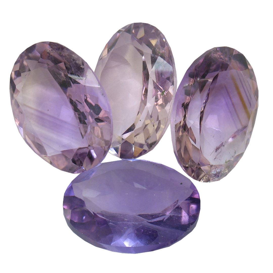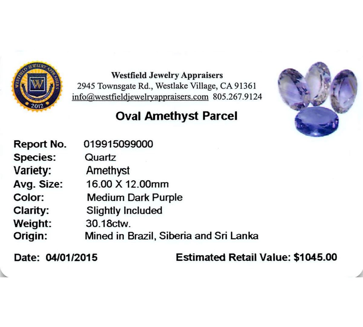Four oval mixed cut natural amethysts exact total weight 30.18ct., clarity is slightly included, type II, medium dark, very slightly grayish, purple color, (GIA P 6/3), cut is good. Westfield Appraised at $1,045.00.