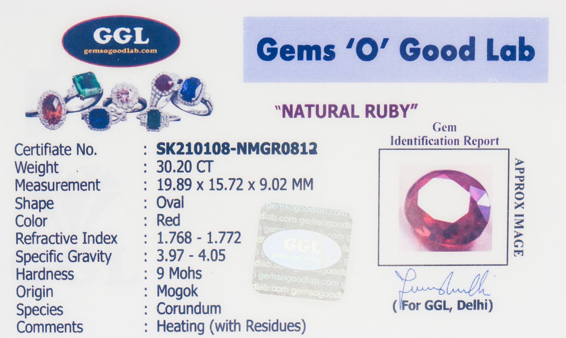 One (1) 30.20 ct oval cut red natural ruby. Origin: Mogok. Accompanied with GGL certificate. 19.89 x 15.72 x 9.02 mm.