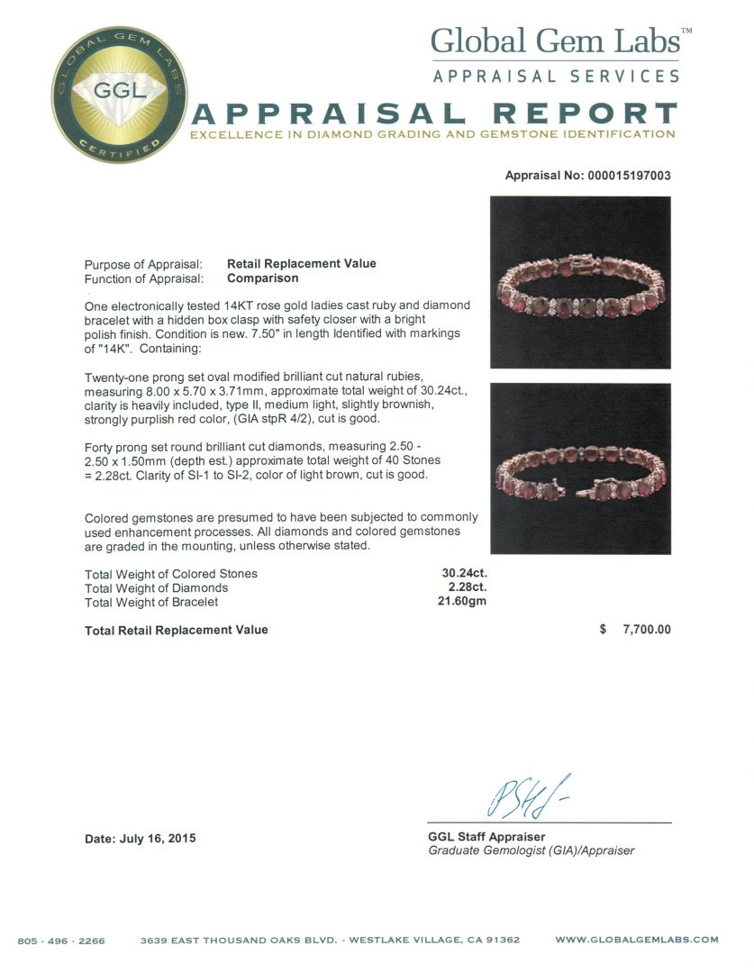 One electronically tested 14KT rose gold ladies cast ruby and diamond bracelet with a hidden box clasp with safety closer with a bright polish finish. 7.50" in length Identified with markings of "14K". Condition is new. Containing: Twenty-one prong set oval modified brilliant cut natural rubies, measuring 8.00 x 5.70 x 3.71mm, approximate total weight of 30.24ct., clarity is heavily included, type II, medium light, slightly brownish, strongly purplish red color, (GIA stpR 4/2), cut is good. Forty prong set round brilliant cut diamonds, measuring 2.50 - 2.50 x 1.50mm (depth est.) approximate total weight of 40 Stones = 2.28ct. Clarity: SI-1 to SI-2, Cut is Good. Colored gemstones are presumed to have been subjected to commonly used enhancement processes. All diamonds and colored gemstones are graded in the mounting, unless otherwise stated. Total Weight of Colored Stones 30.24ct. Total Weight of Diamonds 2.28ct. Total Weight of Bracelet 21.60 grams. GGL Appraised at $7,700.00.