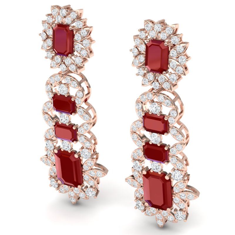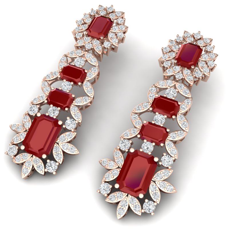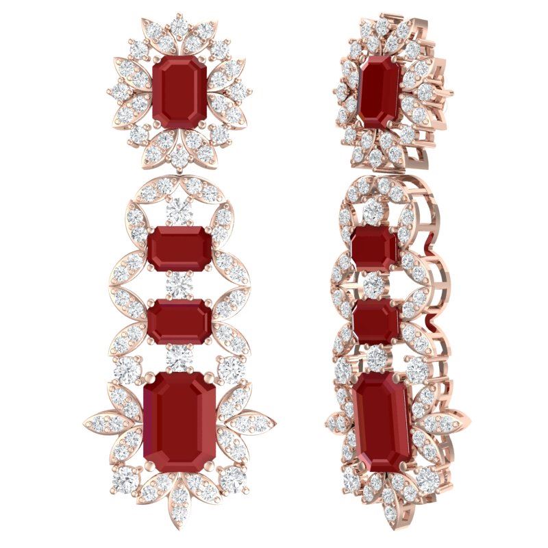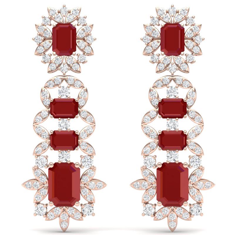 30.25 CTW Royalty Designer Ruby & VS Diamond Earrings 18K Rose Gold ---- Luxury Designer Brand Earring Appraised Retail Price at $51,000 ---- SKU Number US39409 18K Rose gold Earring Size is Larger, Earring measuring approx. 2 1/2 x 1 Inches, weighing in total approx. 20 grams. Made in the USA and is stamped 18K, Main stone 11.56 carat total weight containing 2 pieces of Intense Mid-Opaque Red color with AAA quality Emerald Cut shape cut Ruby , Stone #2 13.07 carat total weight containing 6 pieces of Intense Mid-Opaque Red color with AAA quality Emerald Cut shape cut