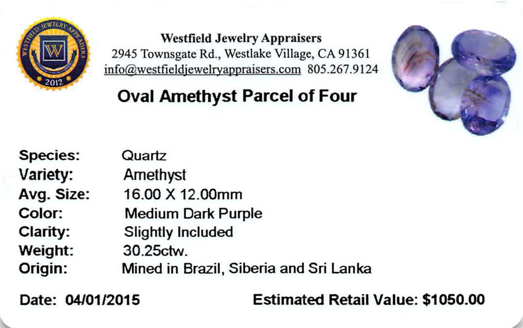 Four oval mixed cut natural amethysts exact total weight 30.25ct., clarity is slightly included, type II, medium dark, very slightly grayish, purple color, (GIA P 6/3), cut is good. Westfield Appraised at $1,050.00.