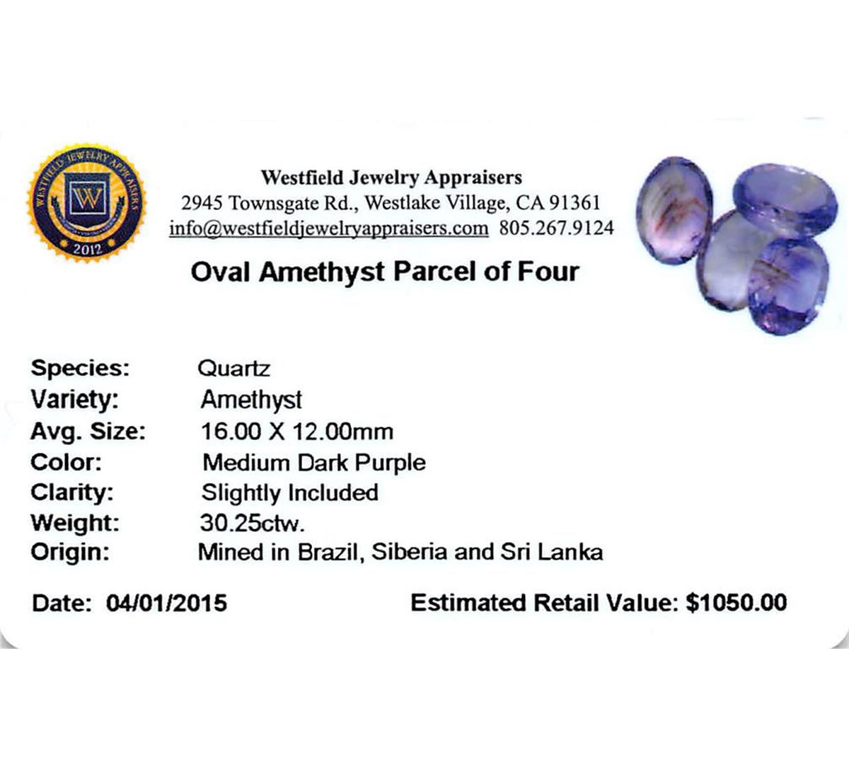 Four oval mixed cut natural amethysts exact total weight 30.25ct., clarity is slightly included, type II, medium dark, very slightly grayish, purple color, (GIA P 6/3), cut is good. Westfield Appraised at $1,050.00.