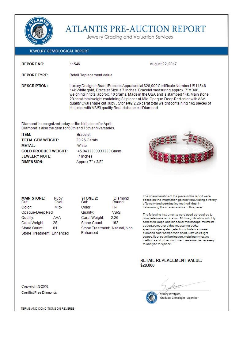 11546 - REF-391X3R ---- 30.26 CTW Ruby & Diamond Bracelet 14K White Gold ---- Luxury Designer Brand Bracelet Appraised at $28,000 Certificate Number US11546 14k White gold, Bracelet Size is 7 Inches, Bracelet measuring approx. 7" x 3/8", weighing in total approx. 40 grams. Made in the USA and is stamped 14k, Main stone 28 carat total weight containing 81 pieces of Mid-Opaque-Deep Red color with AAA quality Oval shape cut Ruby , Stone #2 2.26 carat total weight containing 162 pieces of H-I color with VS/SI quality Round shape cut Diamond