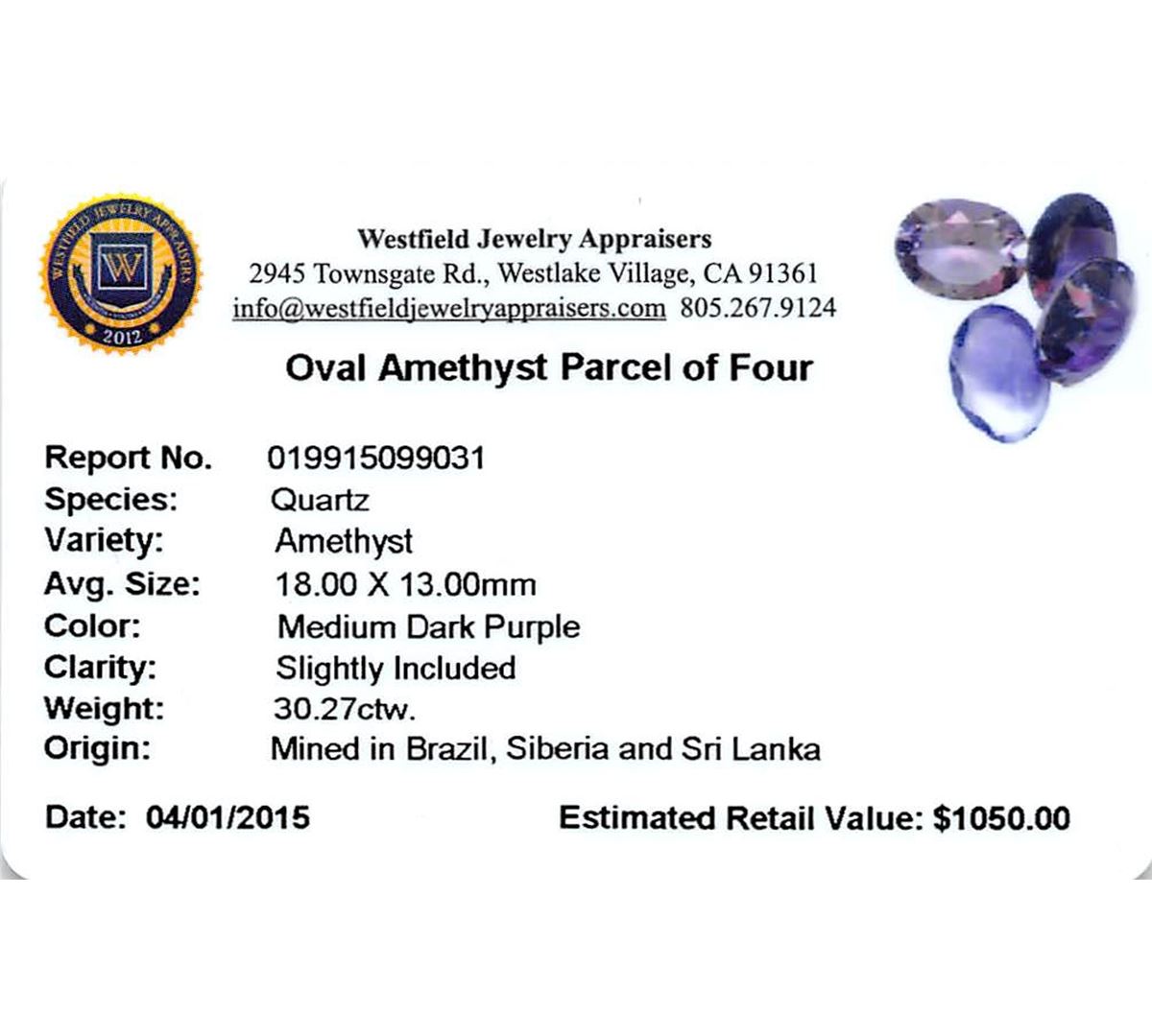 Four oval mixed cut natural amethysts exact total weight 30.27ct., clarity is slightly included, type II, medium dark, very slightly grayish, purple color, (GIA P 6/3), cut is good. Westfield Appraised at $1,050.00.