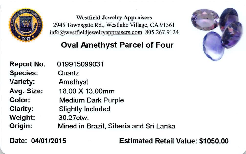 Four oval mixed cut natural amethysts exact total weight 30.27ct., clarity is slightly included, type II, medium dark, very slightly grayish, purple color, (GIA P 6/3), cut is good. Westfield Appraised at $1,050.00.