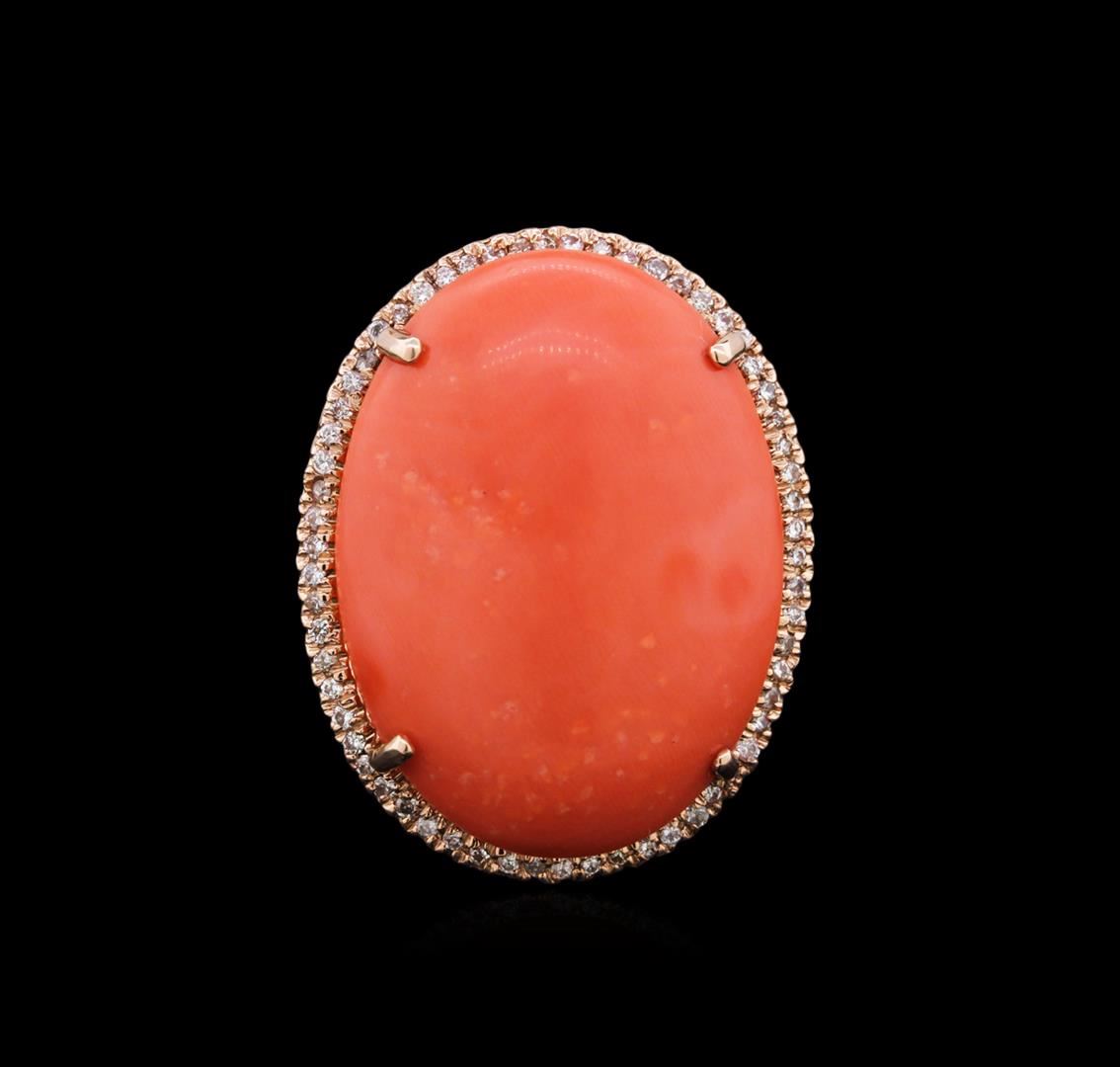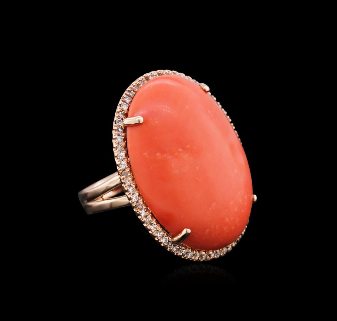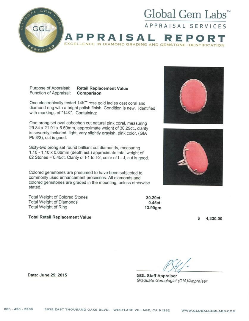 One electronically tested 14KT rose gold ladies cast coral and diamond ring with a bright polish finish. Identified with markings of "14K". Condition is new. Containing: One prong set oval cabochon cut natural pink coral, measuring 29.84 x 21.91 x 6.50mm, approximate weight of 30.29ct., clarity is severely included, light, very slightly grayish, pink color, (GIA Pk 3/3), cut is good. Sixty-Two prong set round brilliant cut diamonds, measuring 1.10 - 1.10 x 0.66mm (depth est.) approximate. Total Weight of 62 Stones = 0.45ct. Clarity: I-1 to I-2. Color: I - J, Cut is Good. Colored gemstones are presumed to have been subjected to commonly used enhancement processes. All diamonds and colored gemstones are graded in the mounting, unless otherwise stated. Total Weight of Colored Stones 30.29ct. Total Weight of Diamonds 0.45ct. Total Weight of Ring 13.90 grams. GGL Appraised at $4,330.00.