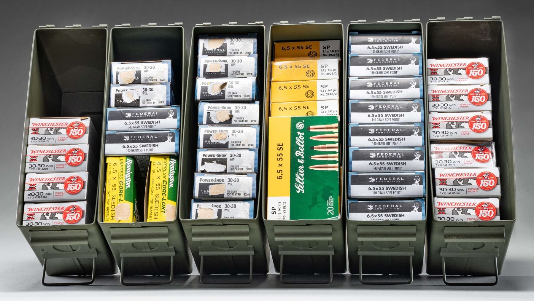All in fine condition and of late commercial production in 20 round boxes contained in 4 near excellent GI style 30 cal. ammo cans. 30-30 AMMO: 10 boxes of Winchester Super-X with 170 grain Power Point bullets. / 10 boxes of Federal Power-Shok with 170 grain SP RN bullets. / 6.5X55 SWEEDISH MAUSER AMMO: 10 boxes of Federal with 140 grain SP bullets. / 10 boxes of Sellier & Bellot with 140 grain SP bullets. / 2 boxes of Remington with 140 grain Core-Lokt PSP bullets; R65SWE1. (02-25177-24/NW). $500-750.