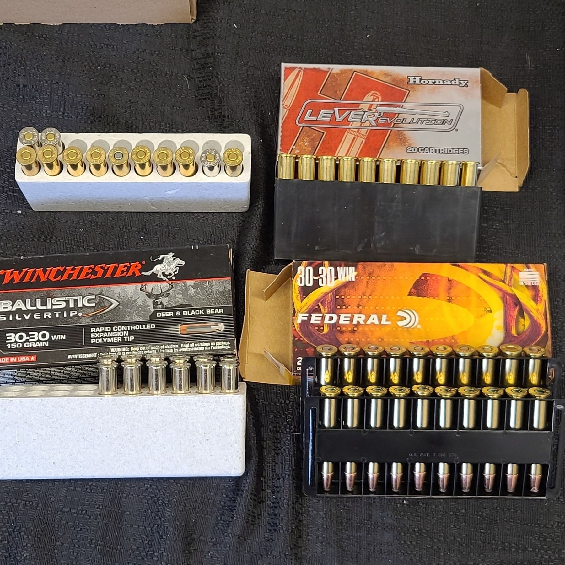 30-30 AMMO TWO FULL BOXES AND TWO PARTIAL BOXES. HORNADY, FEDERAL, AND WINCHESTER