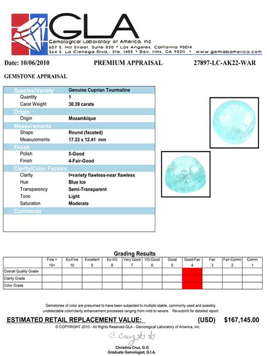 Excellent blue ice color RARE copper-bearing specimen round cut: COPPER in tourmaline is rare and highly prized, it makes the stone color much more vivid (sometimes neon-like) and causes the stone to mimick the reflectivity of diamond; lab quality evaluat