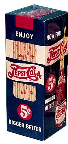 Shows a nice embossed bottle with paper labels and has the marked straws inside. Only light soiling, beautiful box, cond. 9.5.