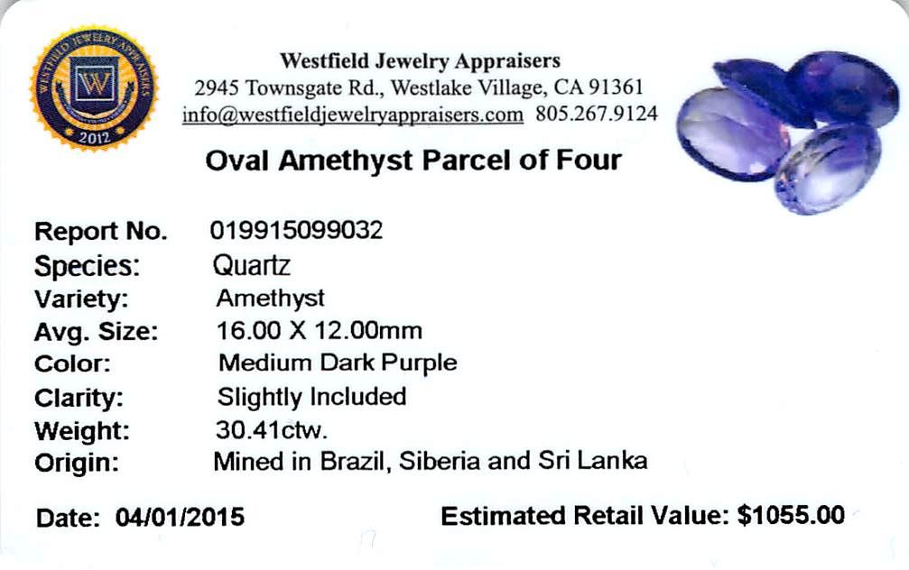 Four oval mixed cut natural amethysts exact total weight 30.41ct., clarity is slightly included, type II, medium dark, very slightly grayish, purple color, (GIA P 6/3), cut is good. Westfield Appraised at $1,055.00.