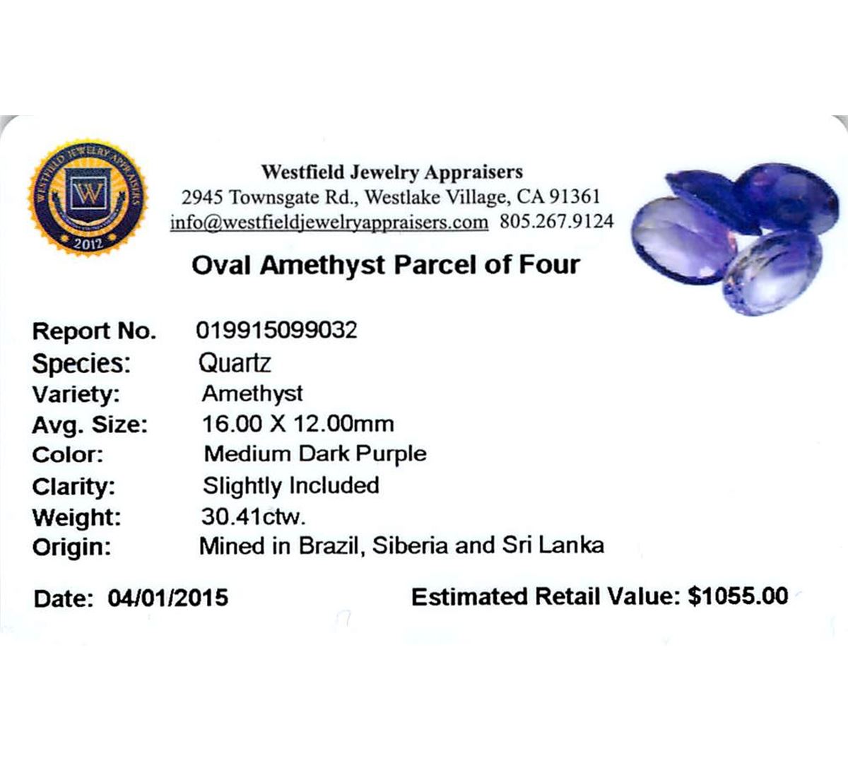 Four oval mixed cut natural amethysts exact total weight 30.41ct., clarity is slightly included, type II, medium dark, very slightly grayish, purple color, (GIA P 6/3), cut is good. Westfield Appraised at $1,055.00.