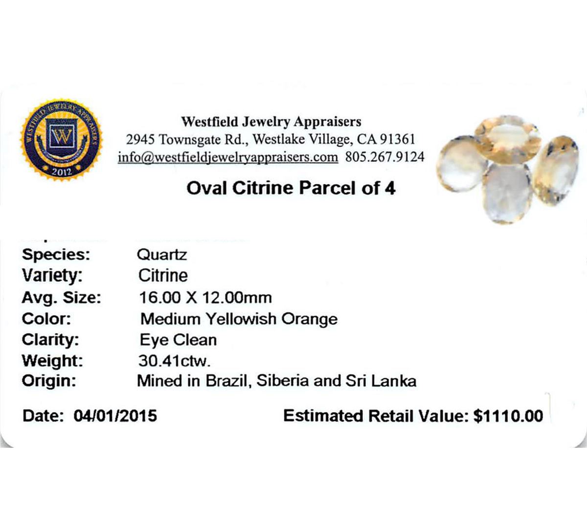 Four oval mixed cut natural citrine quartzs exact total weight 30.41ct., clarity is eye clean, type I, medium, brownish, yellowish orange color, (GIA yO 5/3), cut is good. Westfield Appraised at $1,110.00.