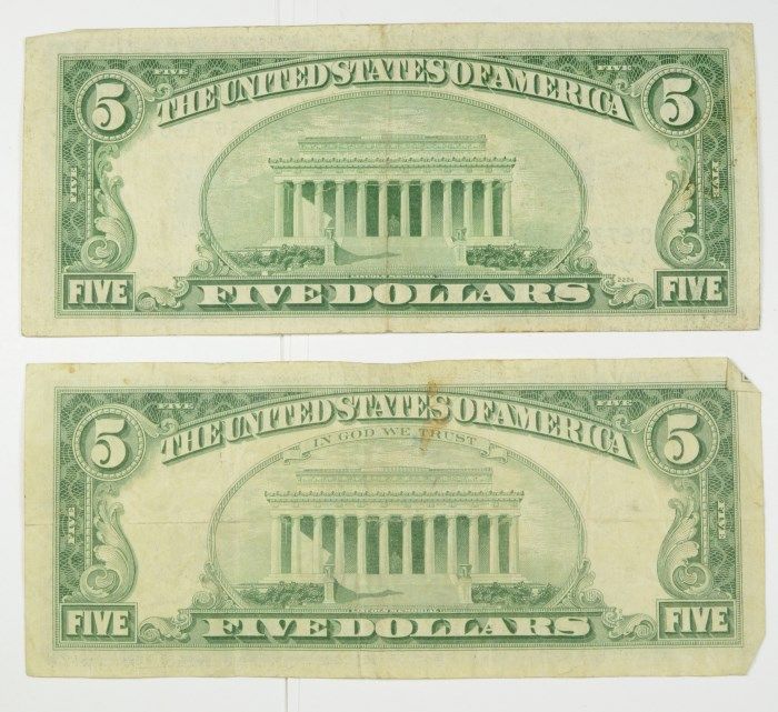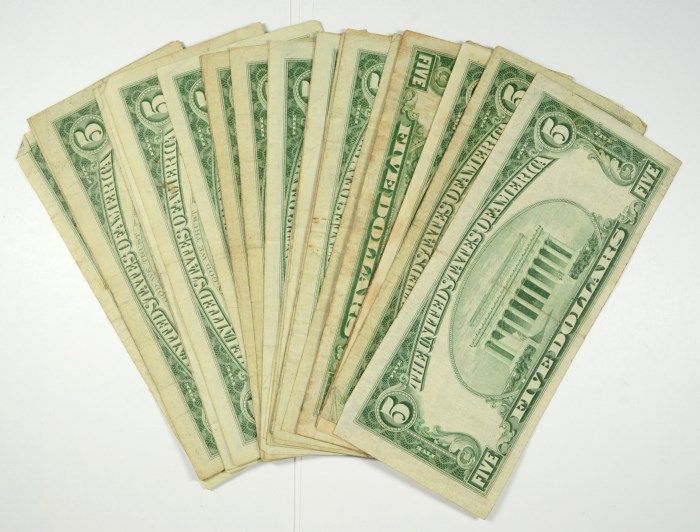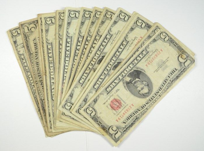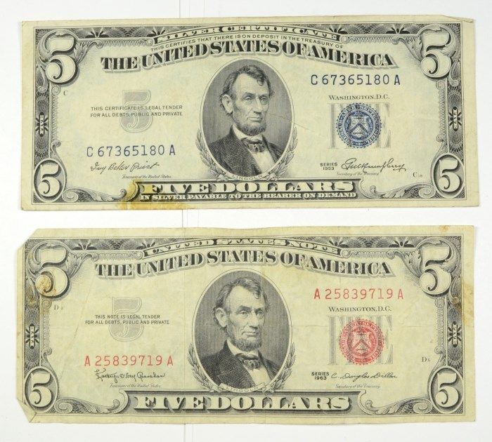 30-$5 RED / BLUE SEAL CURRENCY, AVG CIRCULATED CONDITION