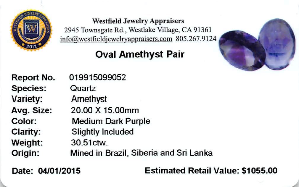 Two oval mixed cut natural amethysts exact total weight 30.51ct., clarity is slightly included, type II, medium dark, very slightly grayish, purple color, (GIA P 6/3), cut is good. Westfield Appraised at $1,055.00.