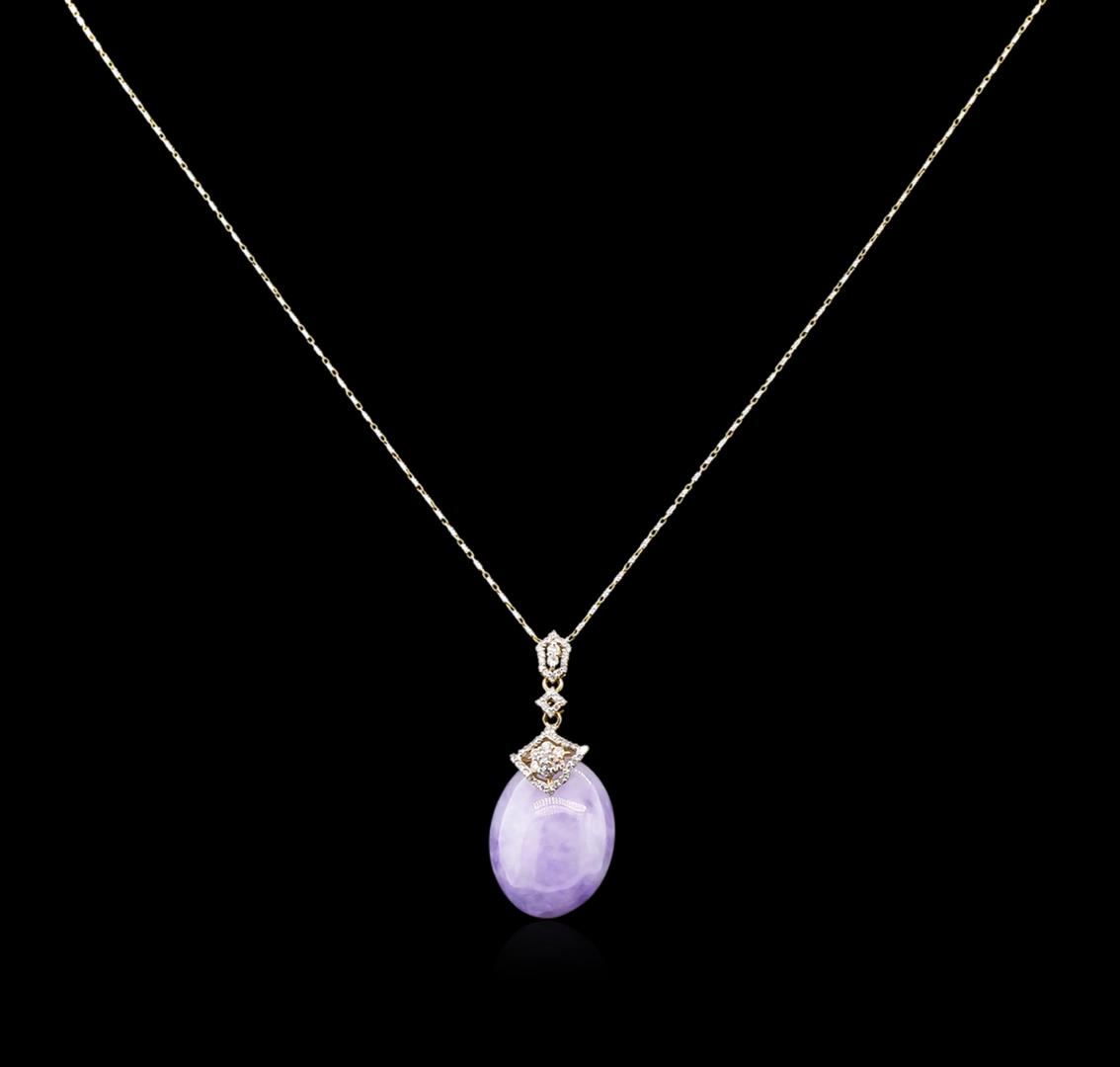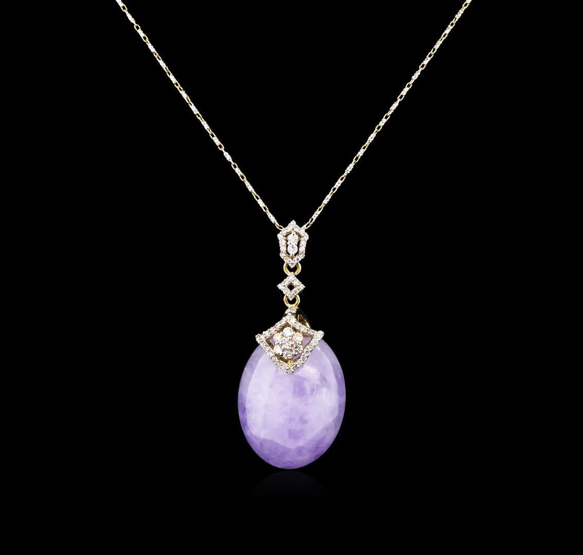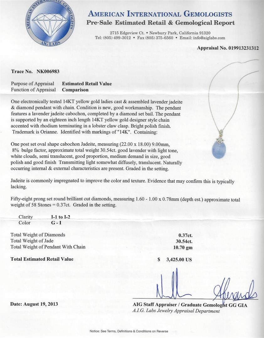 One electronically tested 14KT yellow gold ladies cast & assembled lavender jadeite and diamond pendant with chain. Condition is new, good workmanship. The pendant features a lavender jadeite cabochon, completed by a diamond set bail. The pendant is supported by an eighteen inch length 14KT yellow gold designer style chain accented with rhodium terminating in a lobster claw clasp. Bright polish finish. Trademark is Orianne. Identified with markings of "14K". Containing: One post set oval shape cabochon Jadeite, measuring (22.00 x 18.00) 9.00mm, 8% bulge factor, approximate total weight 30.54ct. good lavender with light tone, white clouds, semi translucent, good proportion, medium demant in size, good polish and good finish Transmitting light somewhat diffusely, translucent. Naturally occurring internal & external characteristics are present. Graded in the setting. Jadeite is commonly impregnated to improve the color and texture. Evidence that may confirm this is typically lacking. Fifty-eight prong set round brilliant cut diamonds, measuring 1.60 - 1.00 x 0.78mm (depth est.) approximate total weight of 58 Stones = 0.37ct. Graded in the setting. Clarity: I-1 to I-2. Color: G - I. Total Weight of Colored Stones: 30.54. Total Weight of Diamonds: 0.37ct. Total Weight of Pendant With Chain: 10.70gm. AIG Appraised at $3,425.00.