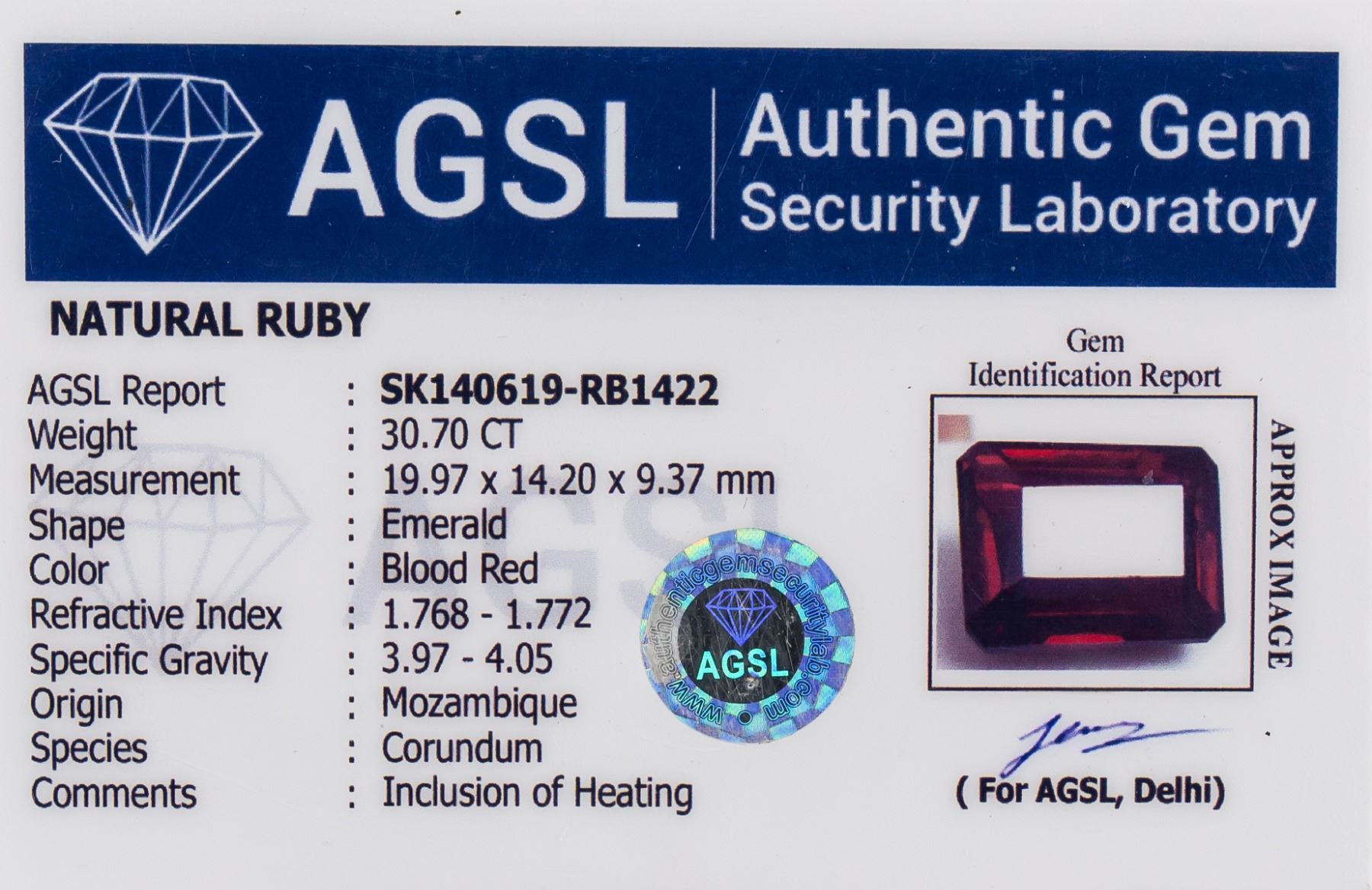 One (1) 30.70 ct emerald cut blood red natural ruby gemstone. 19.97 x 14.20 x 9.37 mm. Origin: Mozambique. Accompanied with AGSL certificate.