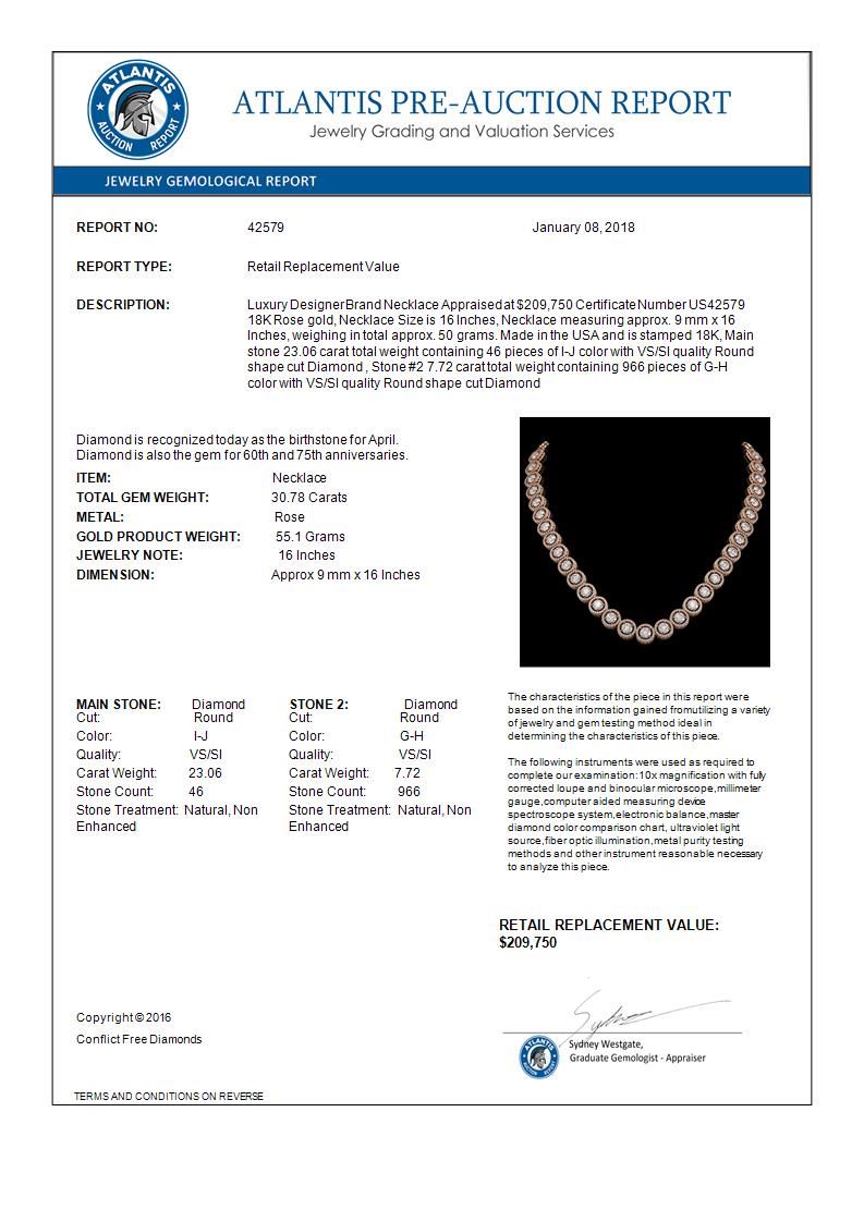 REF-4766H9A -42579 ---- 30.78 CTW Diamond Designer Necklace 18K Rose Gold ---- Luxury Designer Brand Necklace Appraised at $209,750 Certificate Number US42579  18K Rose gold,  Necklace Size is 16 Inches, Necklace measuring approx. 9 mm x 16 Inches, weighing in total approx. 50 grams. Made in the USA and is stamped 18K, Main stone 23.06 carat total weight containing 46 pieces of I-J color with VS/SI quality Round shape cut Diamond , Stone #2 7.72 carat total weight containing 966 pieces of G-H color with  VS/SI quality Round shape cut Diamond
