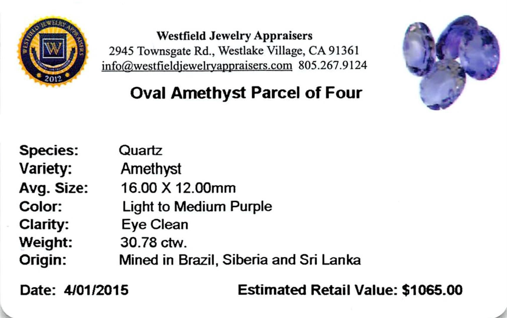 Four oval mixed cut natural amethysts exact total weight 30.78ct., clarity is slightly included, type II, medium dark, very slightly grayish, purple color, (GIA P 6/3), cut is good. Westfield Appraised at $1,065.00.