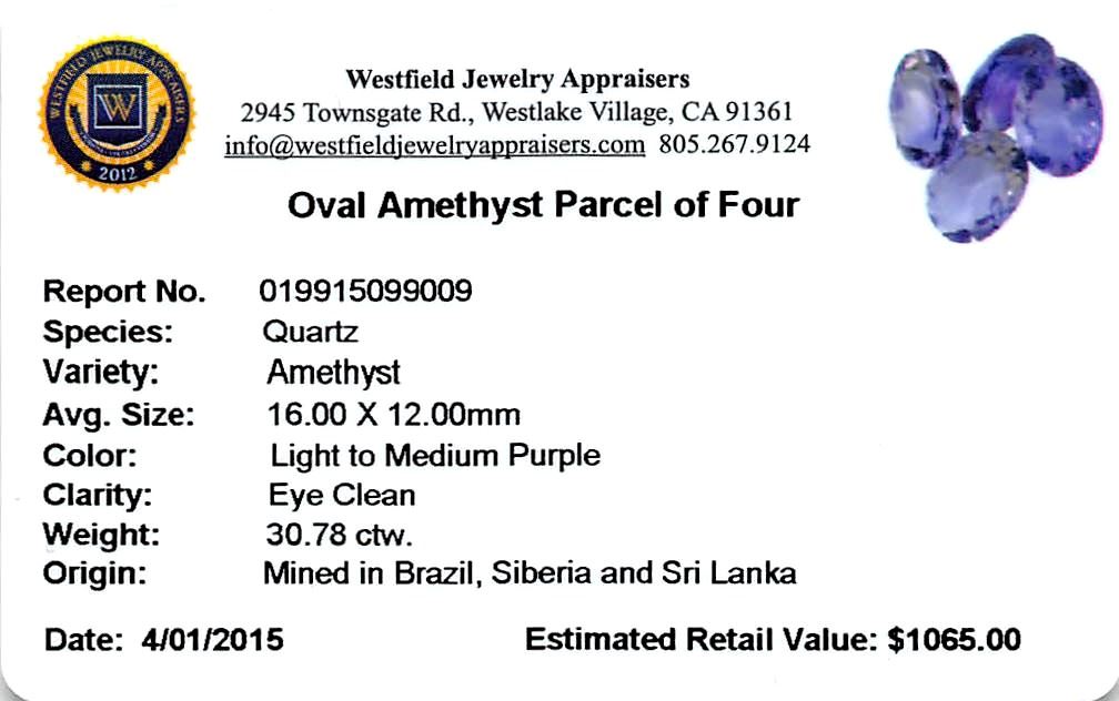 Four oval mixed cut natural amethysts exact total weight 30.78ct., clarity is slightly included, type II, medium dark, very slightly grayish, purple color, (GIA P 6/3), cut is good. Westfield Appraised at $1,065.00.