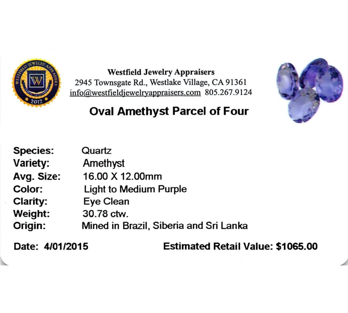Four oval mixed cut natural amethysts exact total weight 30.78ct., clarity is slightly included, type II, medium dark, very slightly grayish, purple color, (GIA P 6/3), cut is good. Westfield Appraised at $1,065.00.