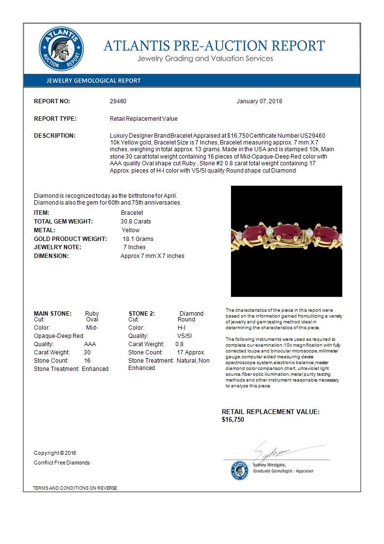 REF-217H5A -29460 ---- 30.8 CTW Ruby & VS/SI Certified Diamond Eternity Bracelet 10K Yellow Gold ---- Luxury Designer Brand Bracelet Appraised at $16,750 Certificate Number US29460 10k Yellow gold, Bracelet Size is 7 Inches, Bracelet measuring approx. 7 mm X 7 inches, weighing in total approx. 13 grams. Made in the USA and is stamped 10k, Main stone 30 carat total weight containing 16 pieces of Mid-Opaque-Deep Red color with AAA quality Oval shape cut Ruby , Stone #2 0.8 carat total weight containing 17 Approx. pieces of H-I color with VS/SI quality Round shape cut Diamond