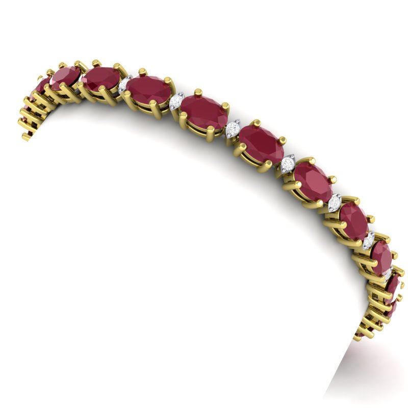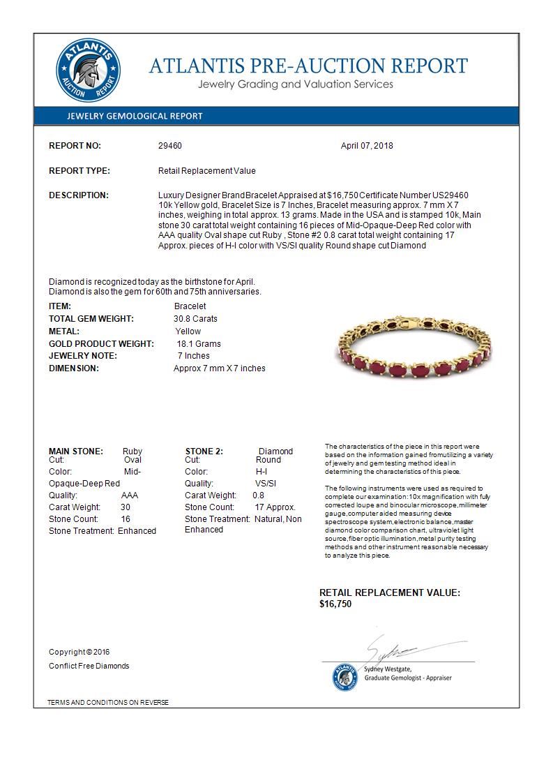 REF-217Y5K -29460 ---- 30.8 CTW Ruby & VS/SI Certified Diamond Eternity Bracelet 10K Yellow Gold ---- Luxury Designer Brand Bracelet Appraised at $16,750 Certificate Number US29460 10k Yellow gold, Bracelet Size is 7 Inches, Bracelet measuring approx. 7 mm X 7 inches, weighing in total approx. 13 grams. Made in the USA and is stamped 10k, Main stone 30 carat total weight containing 16 pieces of Mid-Opaque-Deep Red color with AAA quality Oval shape cut Ruby , Stone #2 0.8 carat total weight containing 17 Approx. pieces of H-I color with VS/SI quality Round shape cut Diamond
