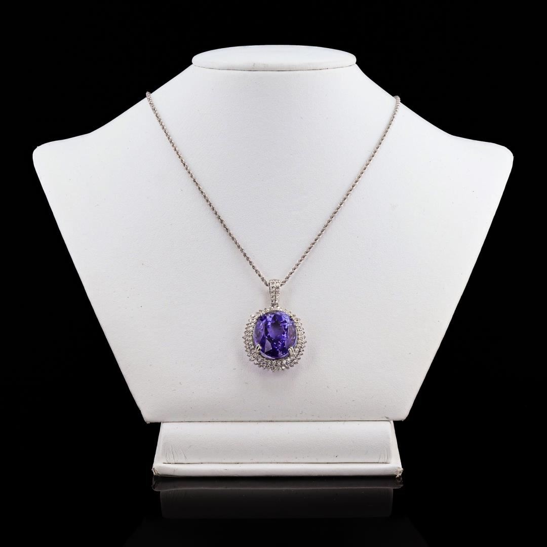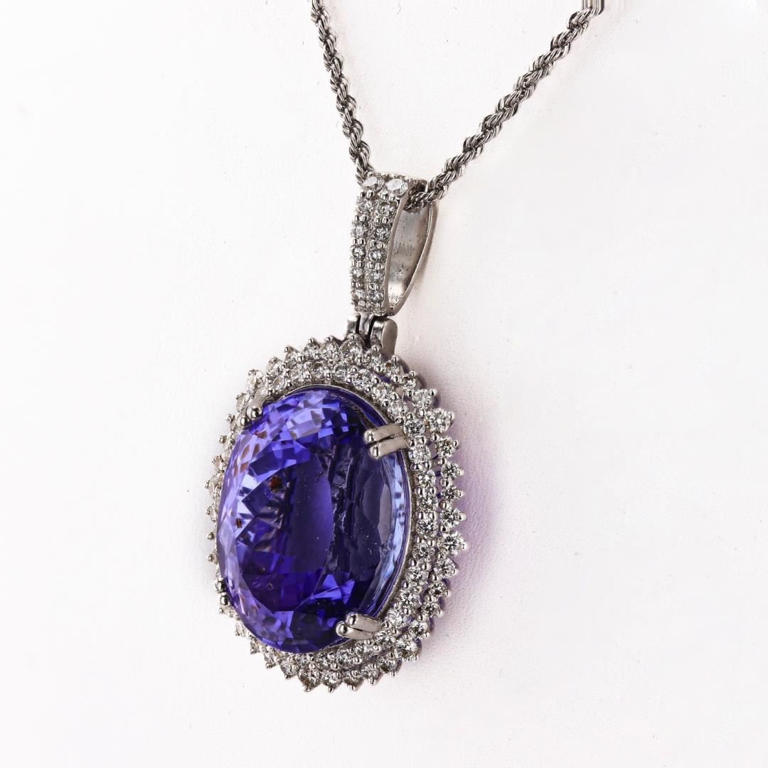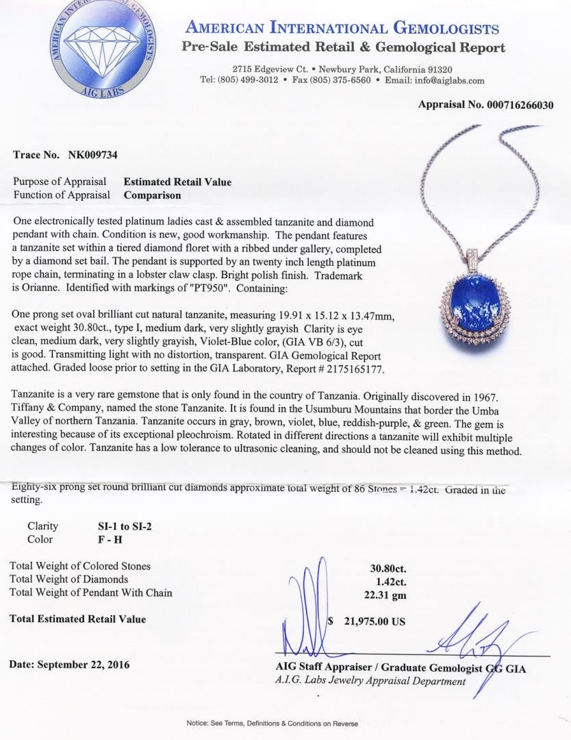 One electronically tested platinum ladies cast & assembled tanzanite and diamond pendant with chain. Condition is new, good workmanship. The pendant features a tanzanite set within a tiered diamond floret with a ribbed under gallery, completed by a diamond set bail. The pendant is supported by an twenty inch length platinum rope chain, terminating in a lobster claw clasp. Bright polish finish. Trademark is Orianne. Identified with markings of "PT950". One prong set oval brilliant cut natural tanzanite, measuring 19.91 x 15.12 x 13.47mm, exact weight 30.80ct., type I, medium dark, very slightly grayish Clarity is eye clean, medium dark, very slightly grayish, Violet-Blue color, (GIA VB 6/3), cut is good. Transmitting light with no distortion, transparent. GIA Gemological Report attached. Graded loose prior to setting in the GIA Laboratory, Report # 2175165177. Tanzanite is a very rare gemstone that is only found in the country of Tanzania. Originally discovered in 1967. Tiffany & Company, named the stone Tanzanite. It is found in the Usumburu Mountains that border the Umba Valley of northern Tanzania. Tanzanite occurs in gray, brown, violet, blue, reddish-purple, & green. The gem is interesting because of its exceptional pleochroism. Rotated in different directions a tanzanite will exhibit multiple changes of color. Tanzanite has a low tolerance to ultrasonic cleaning, and should not be cleaned using this method. Eighty-six prong set round brilliant cut diamonds approximate total weight of 86 Stones l.42ci. Graded in the setting. Clarity SI-1 to SI-2 Color F - H Total Weight of Colored Stones: 30.80ct Total Weight of Diamonds: 1.42ct Total Weight of Pendant With Chain: 22.31 gm Size: 20