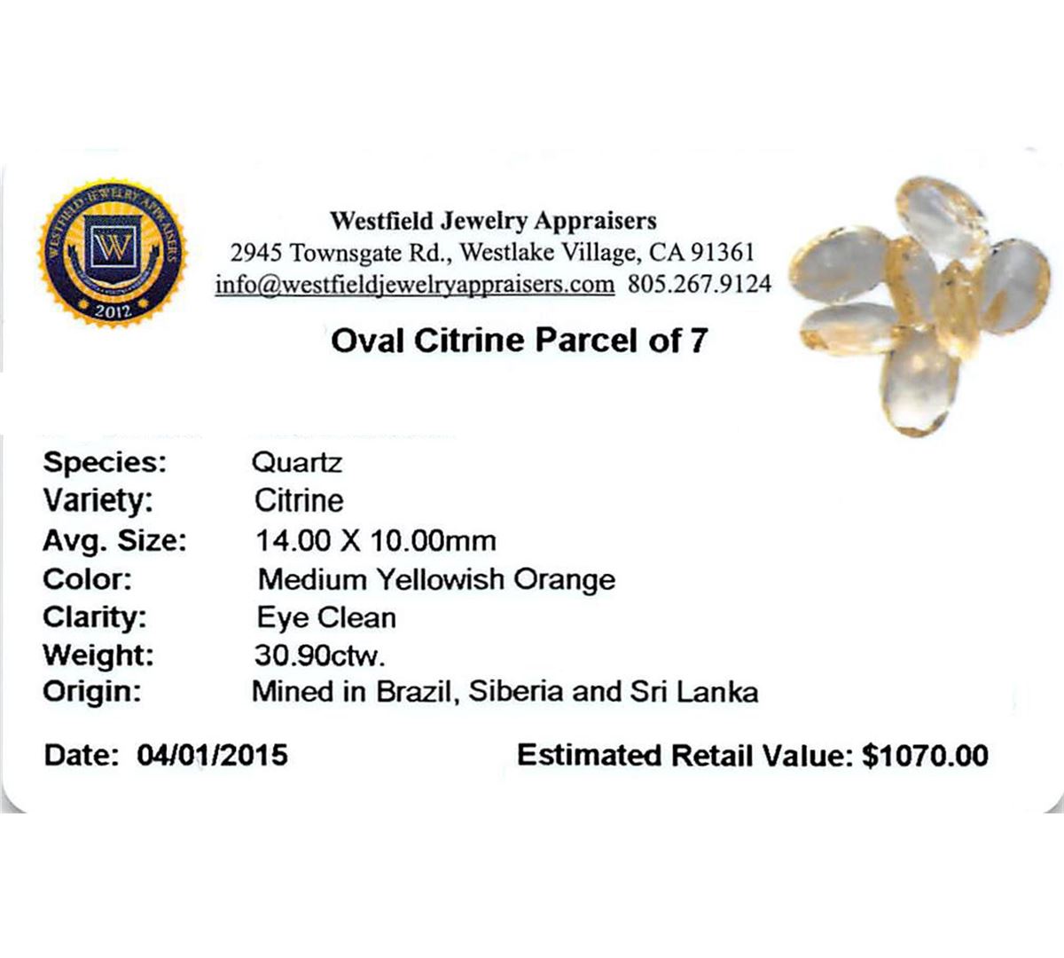 Seven oval mixed cut natural citrine quartzs exact total weight 30.90ct., clarity is eye clean, type I, medium, slightly brownish, yellowish orange color, (GIA yO 5/2), cut is good. Westfield Appraised at $1,070.00.