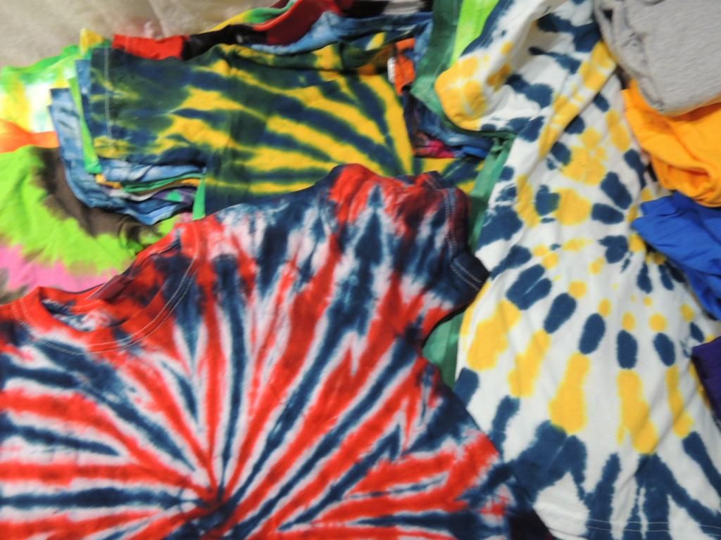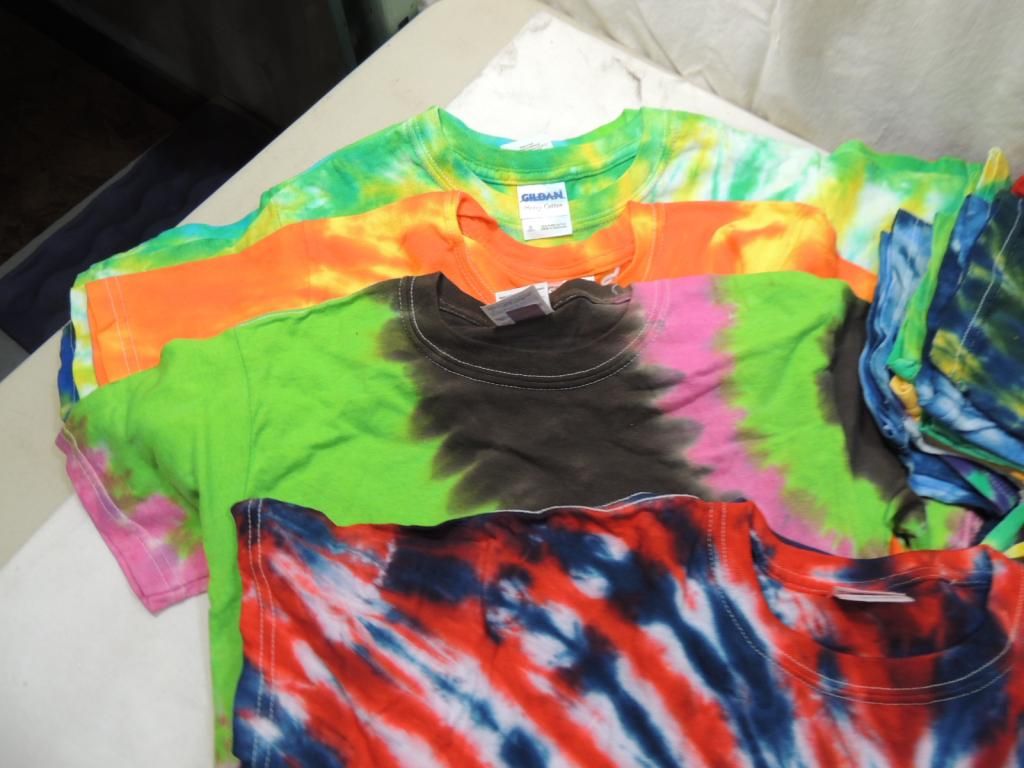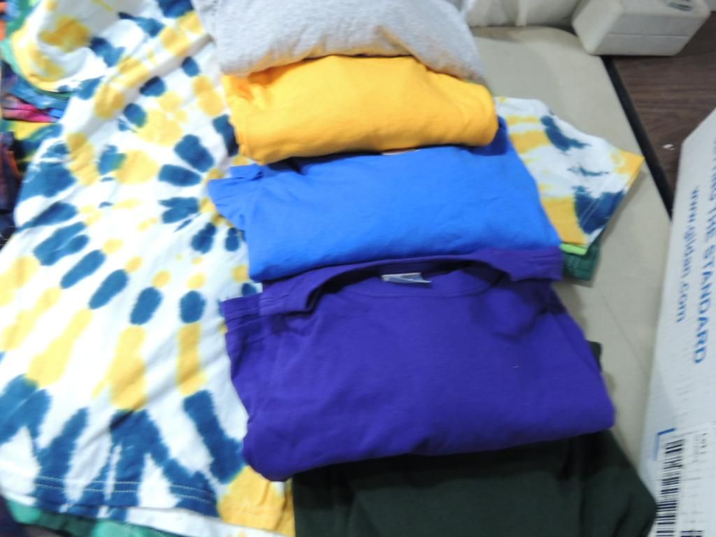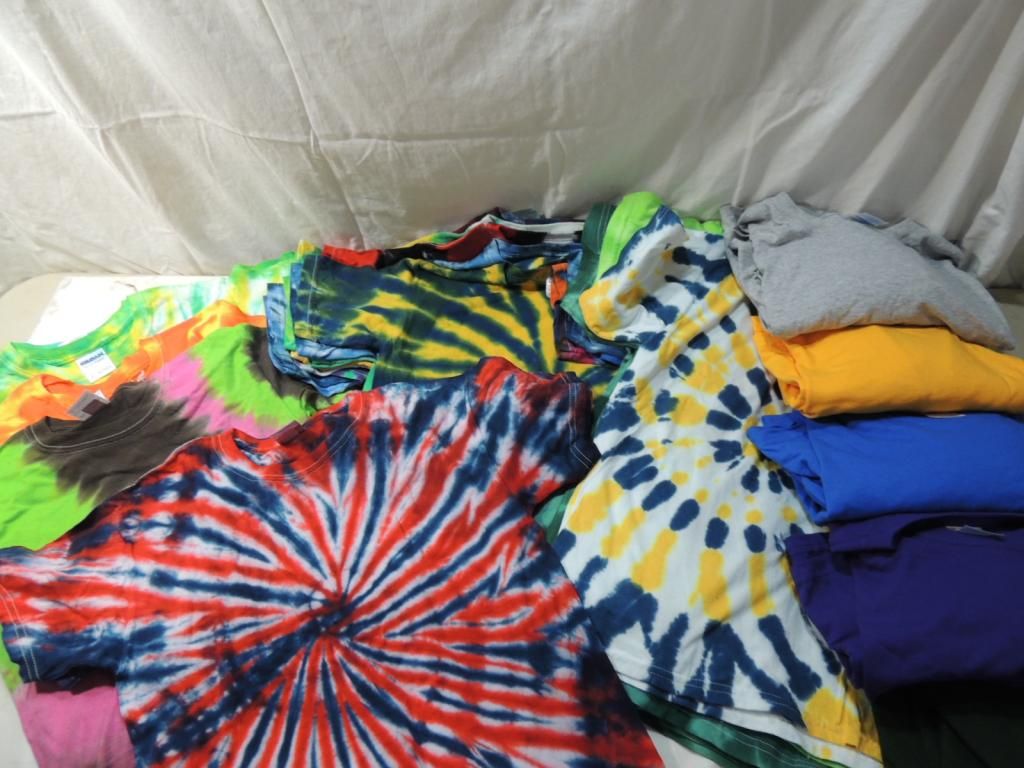 ASSORTED TIE DYE TSHIRTS VARIOUS SIZES. YOUTH AND ADULT. LONG SLEEVE TSHIRTS PLAIN ASSORTED COLORS SIZE 2XL AS SHOWN SEE PHOTO FOR MORE DETAILS.