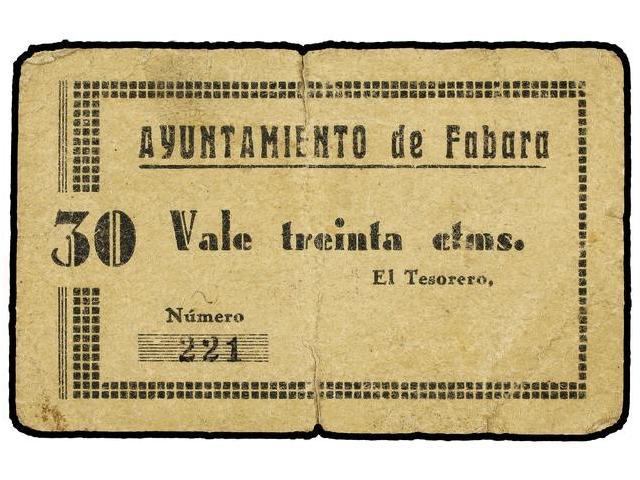 30 Céntimos. S/F. Ay. de FABARA (Zaragoza). Cartón. (Roturas). MUY ESCASO. TFP-88. MBC-.