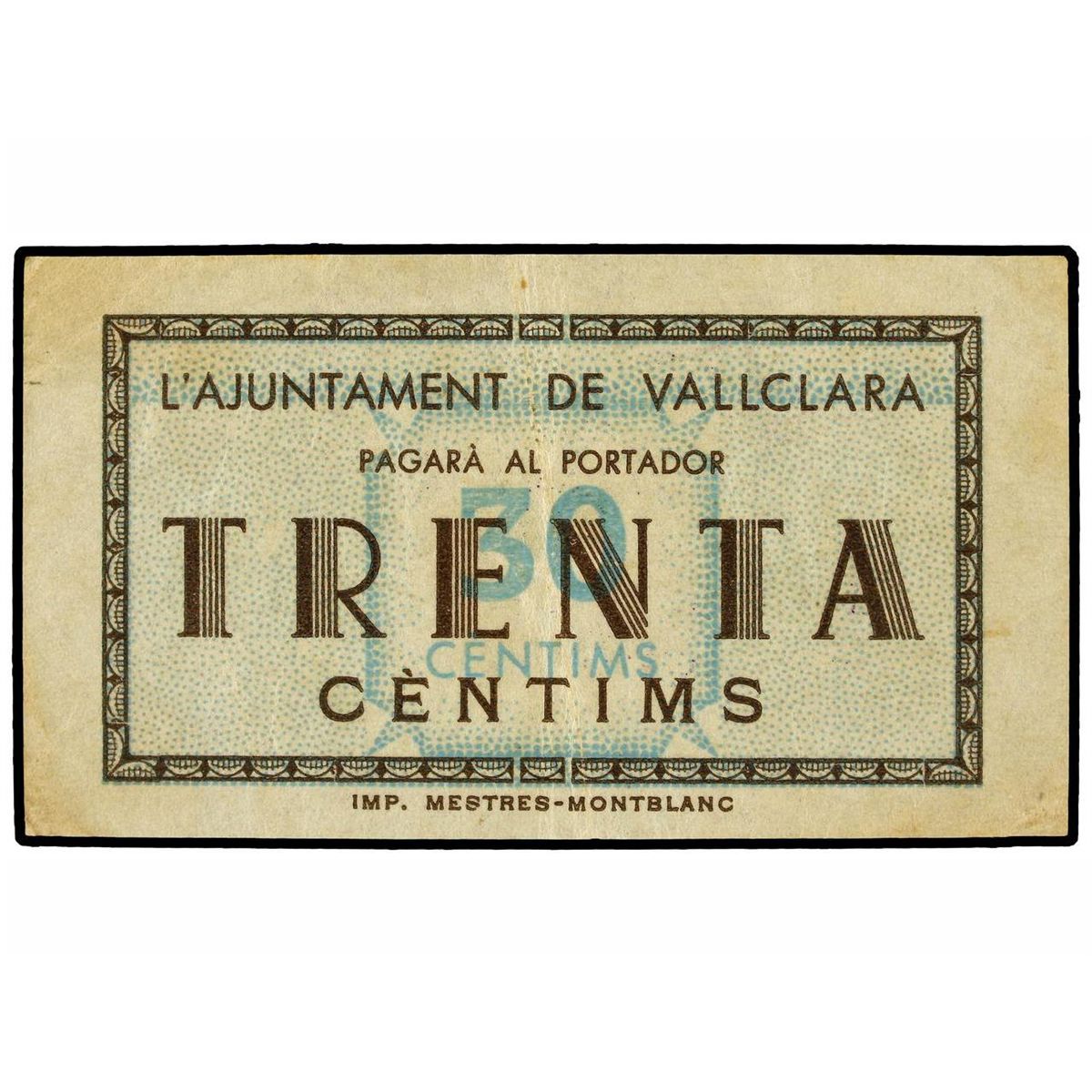 30 Cèntims. - Aj. de VALLCLARA. - MUY RARO. AT-2655; T-3075. MBC+. - -