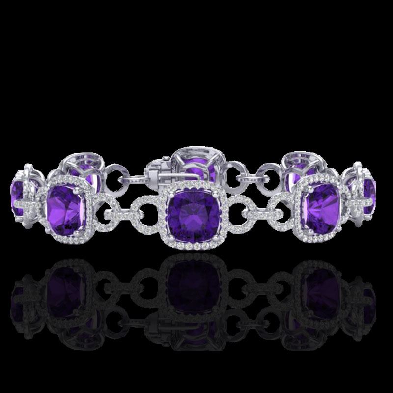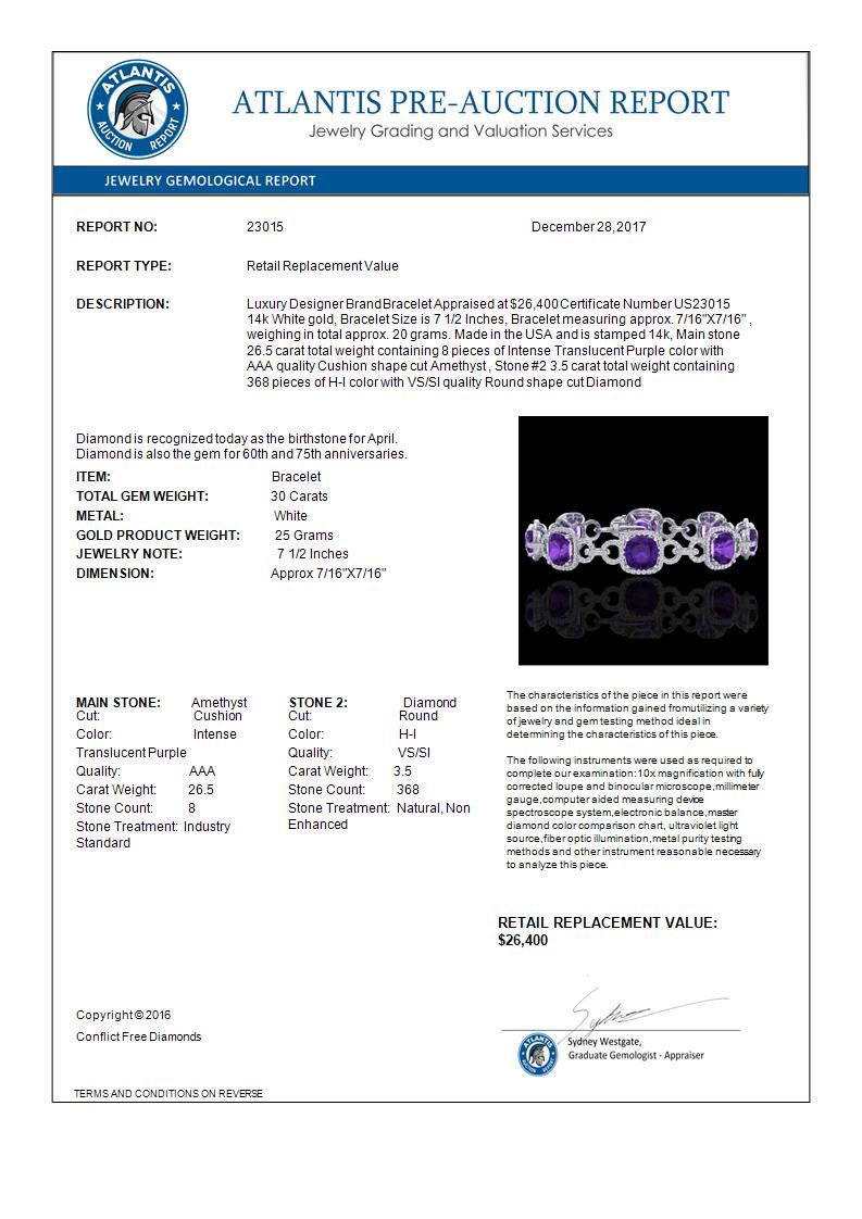 REF-368W9F -23015 ---- 30 CTW Amethyst & Micro VS/SI Diamond Bracelet 14K White Gold ---- Luxury Designer Brand Bracelet Appraised at $26,400 Certificate Number US23015 14k White gold, Bracelet Size is 7 1/2 Inches, Bracelet measuring approx. 7/16"X7/16" , weighing in total approx. 20 grams. Made in the USA and is stamped 14k, Main stone 26.5 carat total weight containing 8 pieces of Intense Translucent Purple color with AAA quality Cushion shape cut Amethyst , Stone #2 3.5 carat total weight containing 368 pieces of H-I color with VS/SI quality Round shape cut Diamond