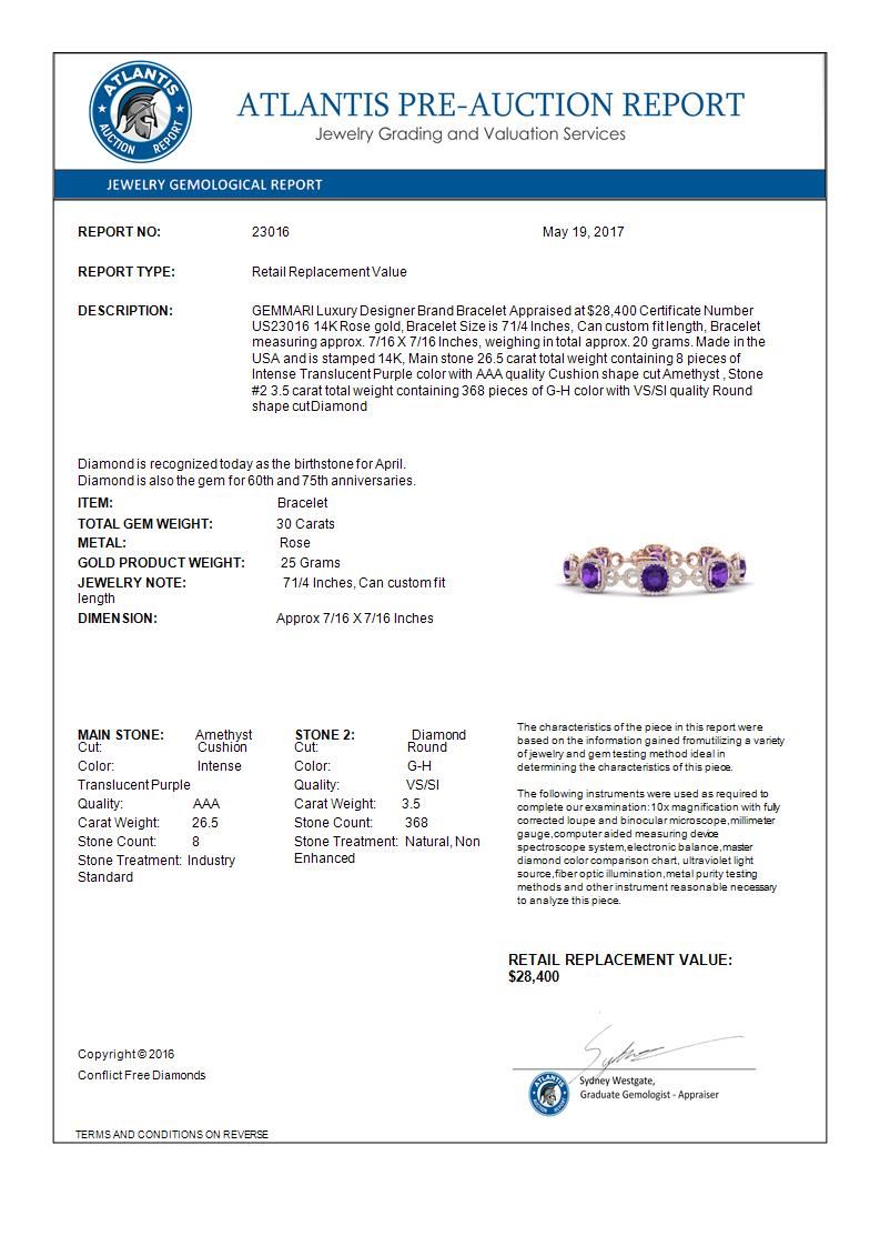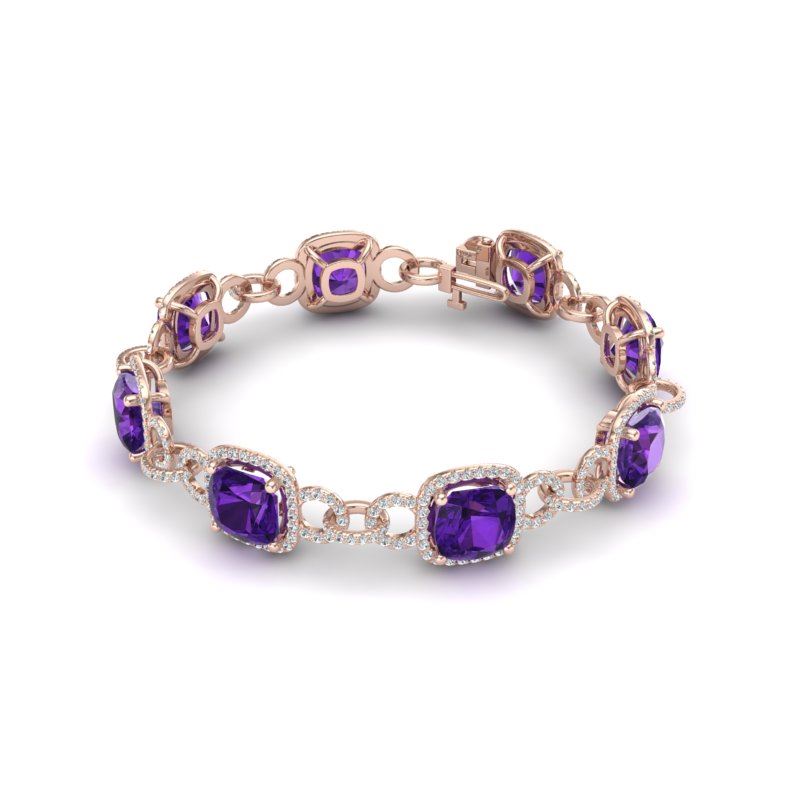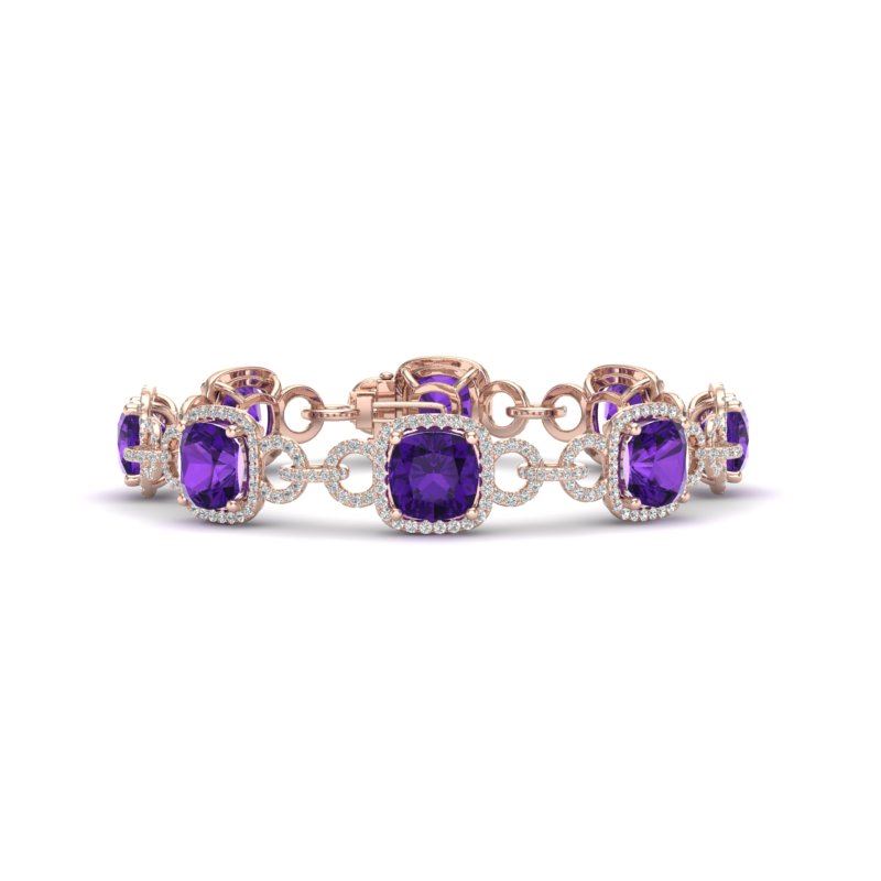 30 CTW Amethyst & VS/SI Diamond Certified Bracelet 14K Rose Gold ---- Luxury Designer Brand Bracelet Appraised Retail Price at $28,400 ---- SKU Number US23016 14K Rose gold Bracelet Size is 71/4 Inches, Can custom fit length, Bracelet measuring approx. 7/16 X 7/16 Inches, weighing in total approx. 20 grams. Made in the USA and is stamped 14K, Main stone 26.5 carat total weight containing 8 pieces of Intense Translucent Purple color with AAA quality Cushion shape cut Amethyst , Stone #2 3.5 carat total weight containing 368 pieces of G-H color with VS/SI quality Round shape cut
