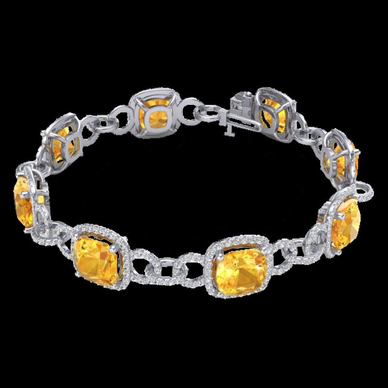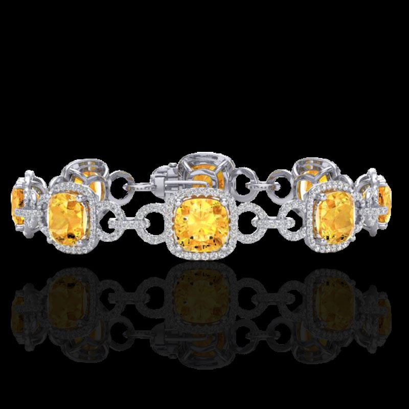 30 CTW Citrine & Micro VS/SI Diamond Certified Bracelet 14K White Gold ---- Luxury Designer Brand Bracelet Appraised Retail Price at $26,400 ---- SKU Number US23018 14k White gold Bracelet Size is 7 1/2 Inches, Bracelet measuring approx. 7/16"X7/16" , weighing in total approx. 20 grams. Made in the USA and is stamped 14k, Main stone 26.50 carat total weight containing 8 pieces of Translucent Yellow color with AAA quality Cushion shape cut Citrine , Stone #2 3.5 carat total weight containing 368 pieces of H-I color with VS/SI quality Round shape cut