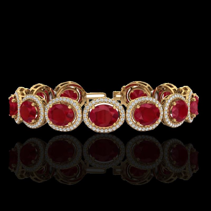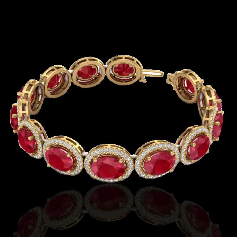 30 CTW Ruby & Micro Pave VS/SI Diamond Certified Bracelet 10K Yellow Gold ---- Luxury Designer Brand Bracelet Appraised Retail Price at $32,500 ---- SKU Number US22696 10k Yellow gold Bracelet Size is 7 1/2 Inches, Bracelet measuring approx. 1/2" X 7.5" , weighing in total approx. 22 grams. Made in the USA and is stamped 10k, Main stone 26.00 carat total weight containing 15 pieces of Mid-Opaque-Deep Red color with AAA quality Oval shape cut Ruby , Stone #2 4 carat total weight containing 375 pieces of H-I color with VS/SI quality Round shape cut