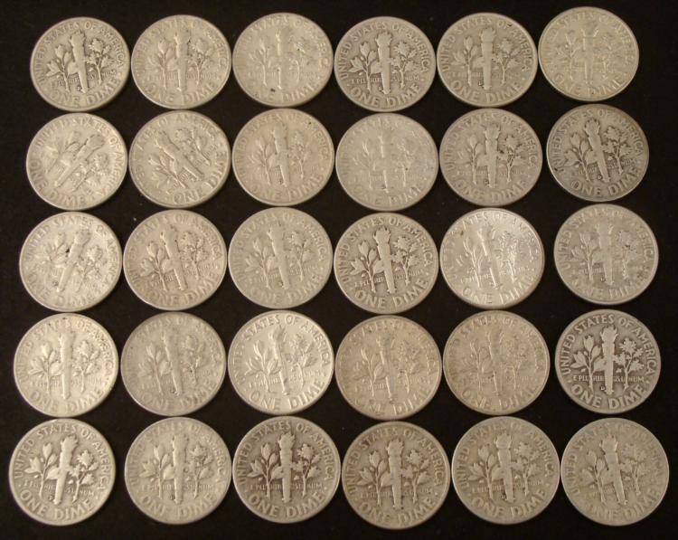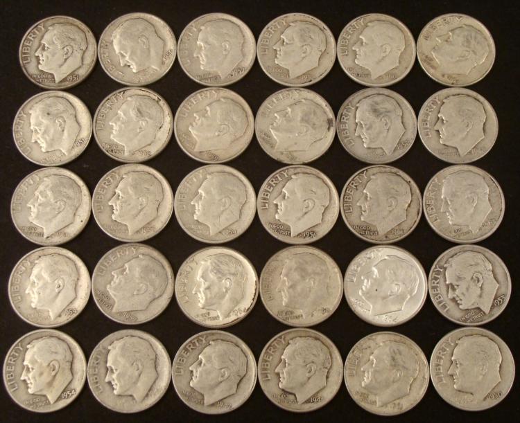 30 Different Date Roosevelt Silver Dimes * Details: Nice setDates: 1946-P, 1947-P, 1948-P, D, 1950-D, 1951-P, D, 1952-P, D, S, 1953-D, 1954-P, D, S, 1956-P, D, 1957-P, D, 1958-D, 1959-P, D, 1960-P, D, 1961-P, D, 1962-D, 1963-P, D, 1964-P, D
