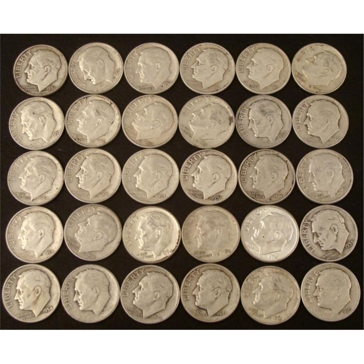 30 Different Date Roosevelt Silver Dimes * Details: Nice setDates: 1946-P, 1947-P, 1948-P, D, 1950-D, 1951-P, D, 1952-P, D, S, 1953-D, 1954-P, D, S, 1956-P, D, 1957-P, D, 1958-D, 1959-P, D, 1960-P, D, 1961-P, D, 1962-D, 1963-P, D, 1964-P, D