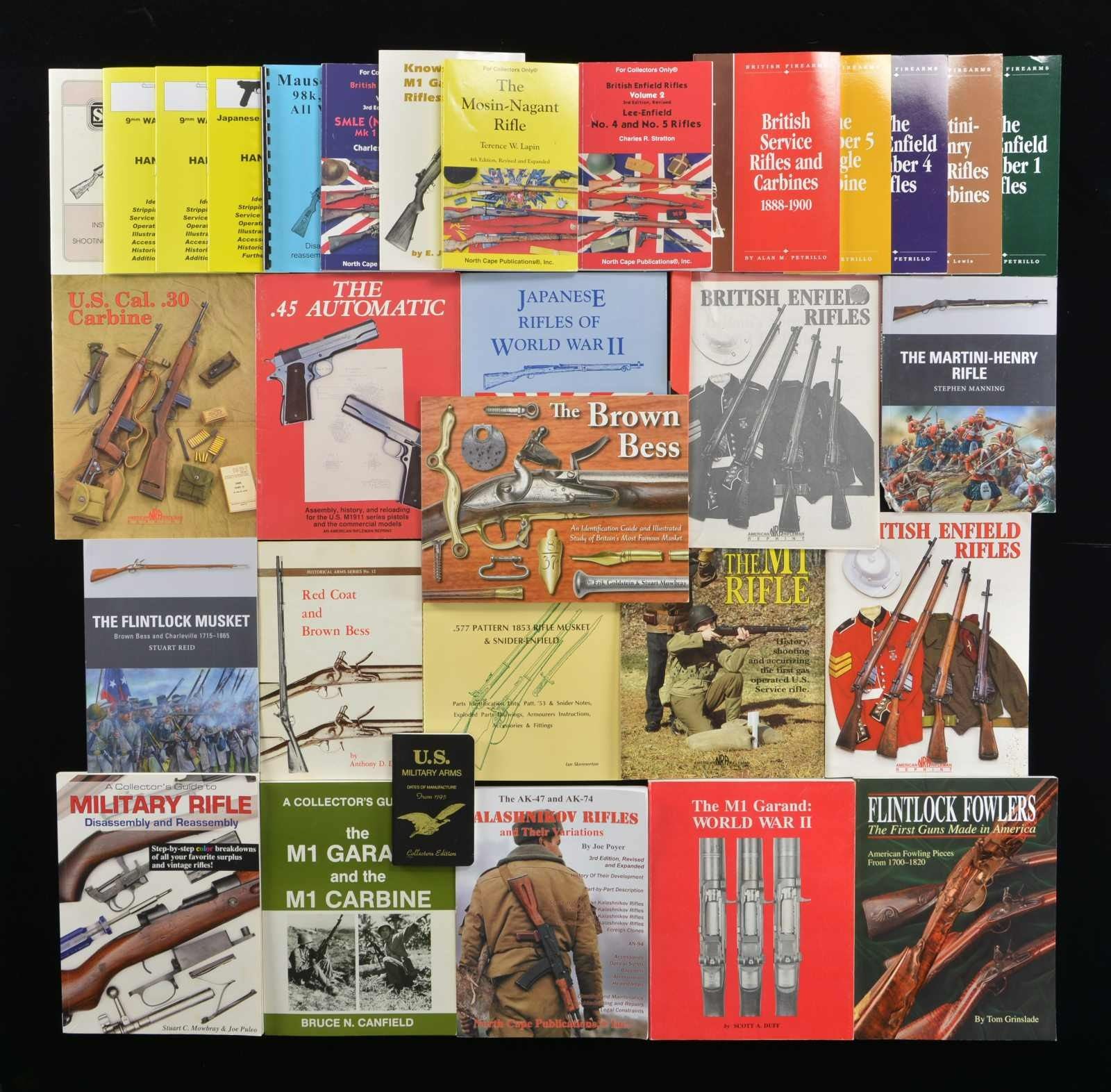 Books include, but not limited to: "The Brown Bess: Identification Guide & Study of Britain's Most Famous Musket" by Erik Goldstein. "Flintlock Fowlers" by Tom Grinslade. "British Firearms Series: the Lee Enfield Number 1, Martini-Henry .450 Rifles & Carbines, The Lee Enfield Number 4 Rifles, The Number 5 Jungle Carbines, British Service Rifles & Carbines 1888-1900". "The M1 Garand, World War II" by Scott A. Duff. "A Collector's Guide to Military Rifle Disassembly and Reassembly" by Stuart C. Mowb. "The Mosin-Nagant Rifle" by Terence W Lapin, 4th Edition. "A Collector's Guide to the M1 Garand and the M1 Carbine" by Bruce Canfield. North Cape Publications Volumes 1 & 2" British Enfield Rifles". by Charles Stratton. CONDITION: balance fair to good showing wear & fraying commensurate w/ light use. (02-19611-5/MD). $150-200.