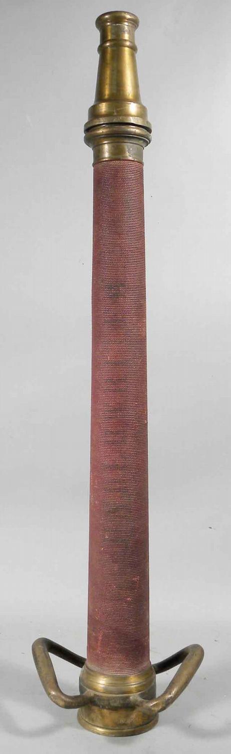 30" Factory Play Pipe Fire Nozzle. Brass with woven covering. Mfg. by Boston Woven Hose & rubber Co. Very good condition.