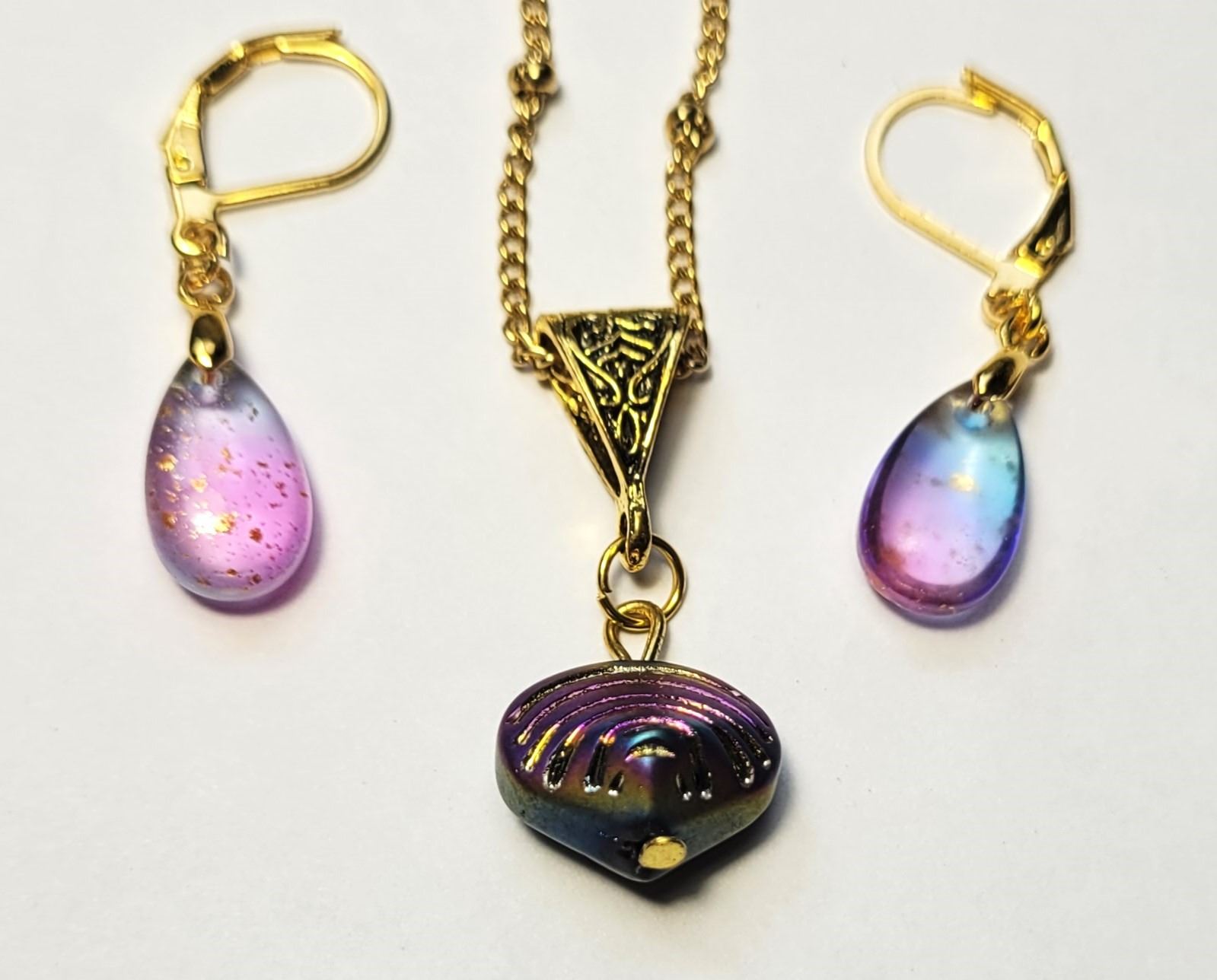 GOLD DROP EARRINGS ON LEVERBACK WIRES & SEASHELL PENDANT ON 18" CHAIN. JEWELERY