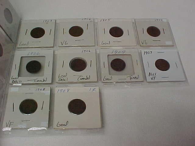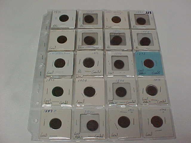 30 Indian Cents in 2x2: 1875 AG, 80 AG, 3-81 (AG, G, F), 2-82 (AG, G), 2-83 (AG,G), 89 AG corrosion, 90 G, 2-93 both G corrosion, 94 G, 98 G corr, 99 G corr, 99 G, 00 G corr, 01 G, 02 G, 03 G, 04 VG, 05 G, 06 VG, 2-06 G corr, 2-07 (G,VF),2-08 (G,VF)