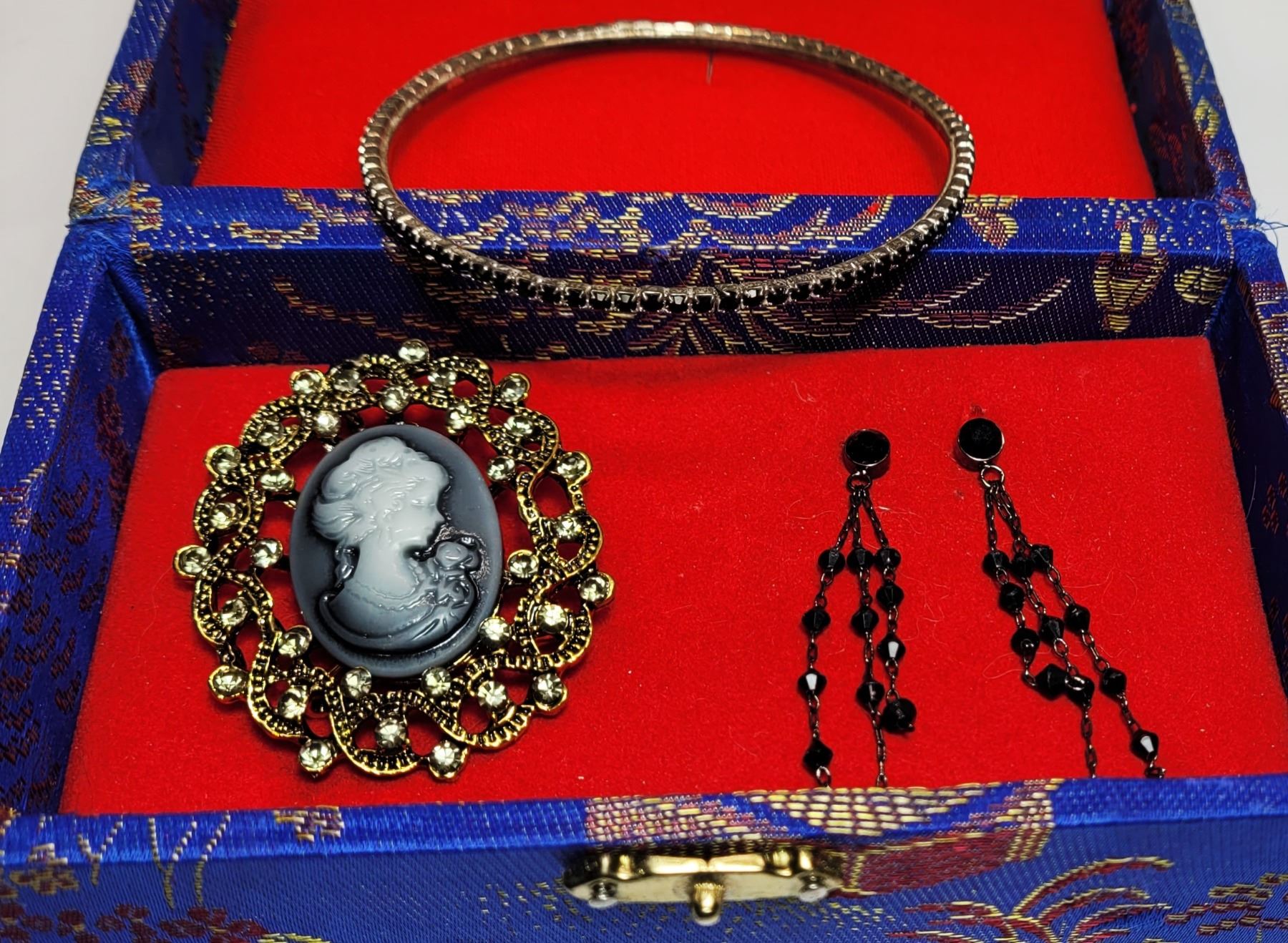 BRACELET SET WITH BLACK CRYSTALS, BLACK CRYSTAL STUD, DROP EARRINGS AND GREY CAMEO BROOCH/PENDANT WITH CRYSTAL ACCENTS IN AN ASIAN INSPIRED GIFT BOX. JEWELLERY