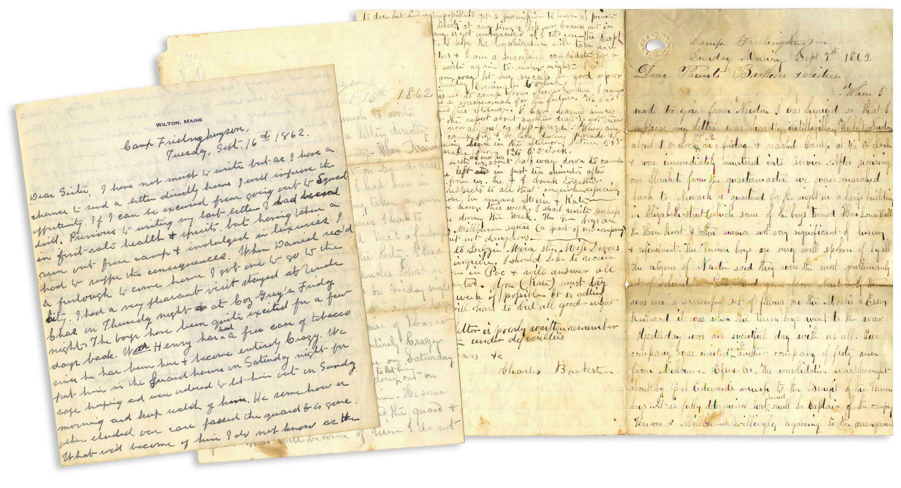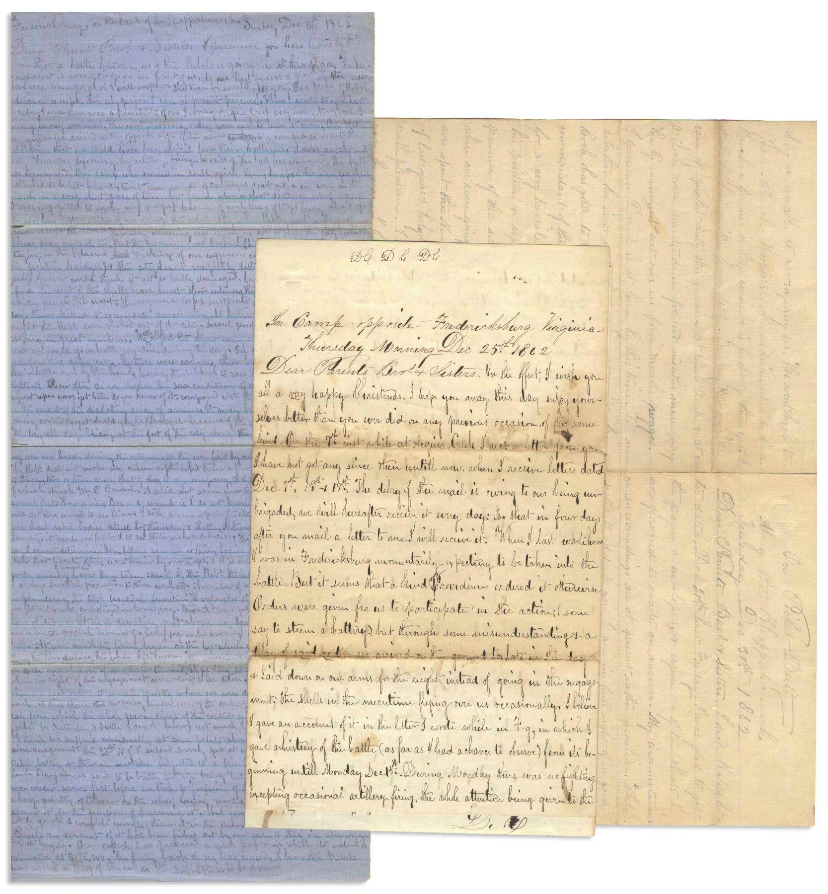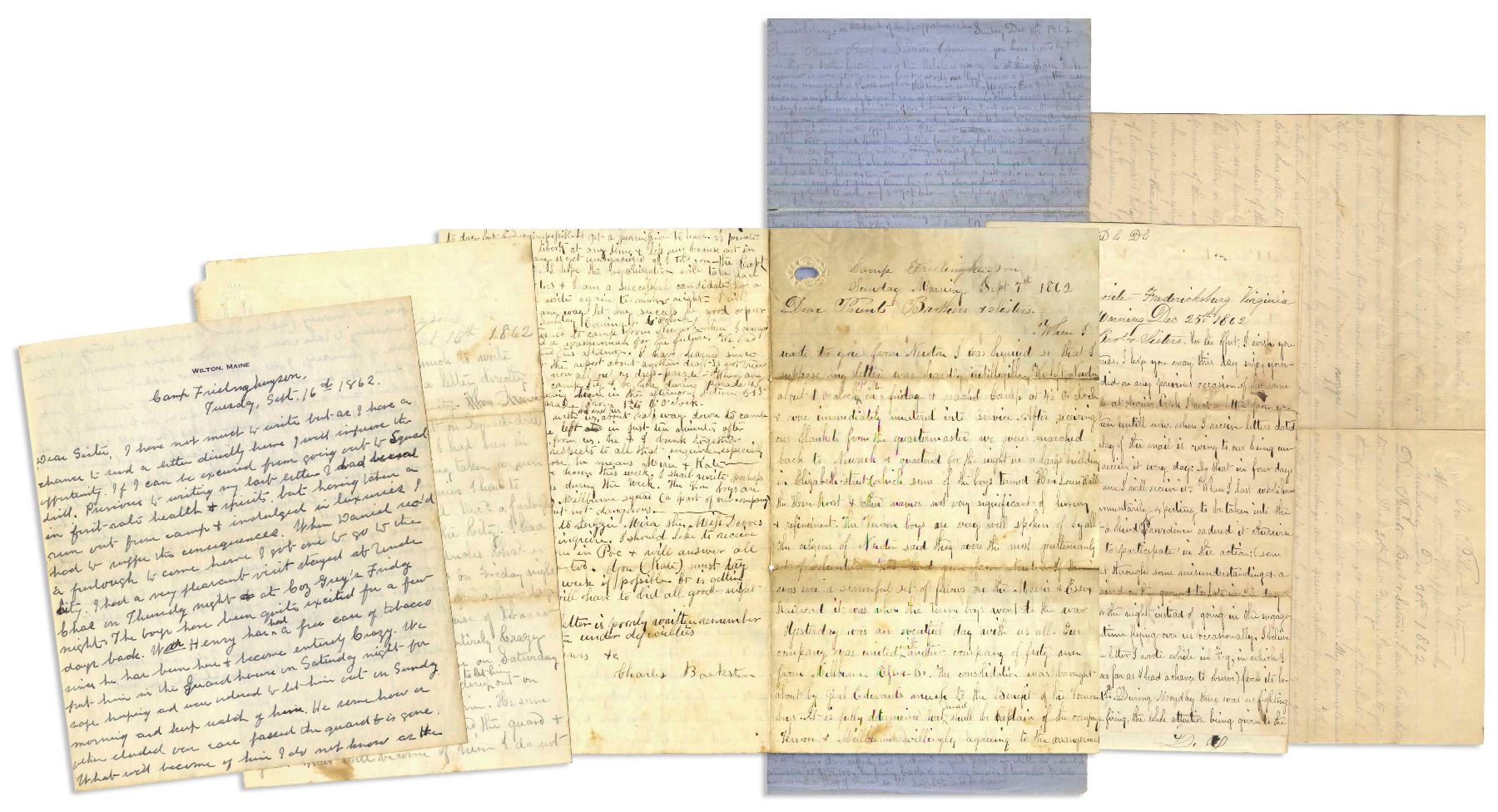 Collection of 30 letters - many diary-style spanning several days, by Sergeant Charles Baxter of the 27th New Jersey Infantry, an articulate officer who describes the Battle of Fredericksburg in several letters during the battle and immediately afterwards, in addition to writing vividly about slavery and other incidents of the War. The lot also includes five letters written by Baxter during the War, but after his enlistment, and well as over 50 letters and documents of the Baxter family in the 19th century. Baxter's first Fredericksburg letter spans two days, written from ''Fredricksburg on the bank of the Rappahannock'' on 14 December 1862, in part, ''...A shell burst over our heads a piece of which struck Wm. C. Bonnel. A solid shot came near the left flank entering the ground several feet. How serious B-'s wound is I do not know as he was carried off before I could get close enough to see him. I took a run up in the city while we were laying idle, saw five dead Rebel bodies killed by Thursday's shells. Although they were traitors to their country, it made me feel bad to see their mangled bodies. The extent of Rebel loss on Thursday I cannot determine. Some fellows saw two or three bodies beside what I saw myself & that twenty others were buried by our troops & it is very natural to suppose that a goodly number of wounded would have been taken care of by the Rebs themselves. As the number of killed is always smaller in number to their wounded...''