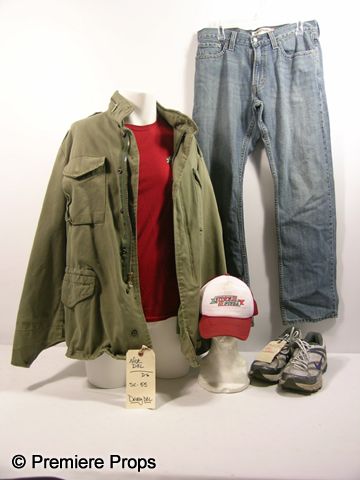 What could be safer than being a neighborhood pizza delivery boy? Not much, if you're Nick (Jesse Eisenberg) and a group of not-real-bright criminals kidnap you to rob a bank for them. This is Nick's stunt double's, army green zip up jacket, dark red with Vito's Pizza logo on the front and back t-shirt, (size S) light blue denim 'Levis' jeans, (size 34 x 32) white and dark red trucker style Vito's Pizza adjustable hat, and grey and blue Nike Zoom running shoes. (size 11) Includes wardrobe tag.