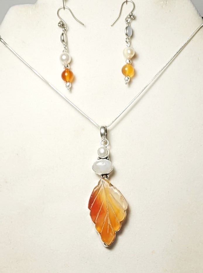 WITH MOONSTONE AND PEARL ACCENTS STAMPED 925 & MATCHING CARNELIAN, PEARL AND MOONSTONE DROP EARRINGS.  JEWELERY