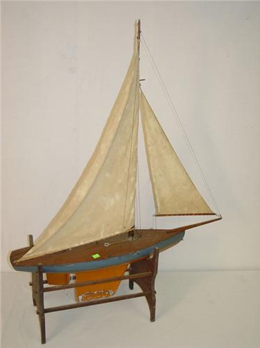 30" PAINTED WOODEN POND BOAT W/ CANVAS SAIL & METAL KEEL ON CONTEMPORARY BASE - LOSSES & PAINT WEAR