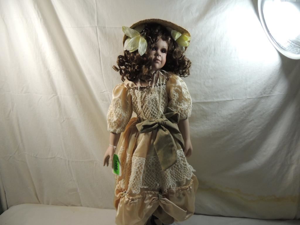 RETIRED DOLL, PARADISE GALLERY DOLLS LITTLE HOUSE ON THE PRAIRIE STYLE? VICTORIAN STYLE? PORCELAIN DOLL. BROWN CURLY HAIR LACE AND SATIN DRESS STRAW HAT FLOWERS. BROWN EYES. ON STAND COLLECTIBLE AS SHOWN SEE PHOTO FOR MORE DETAILS.