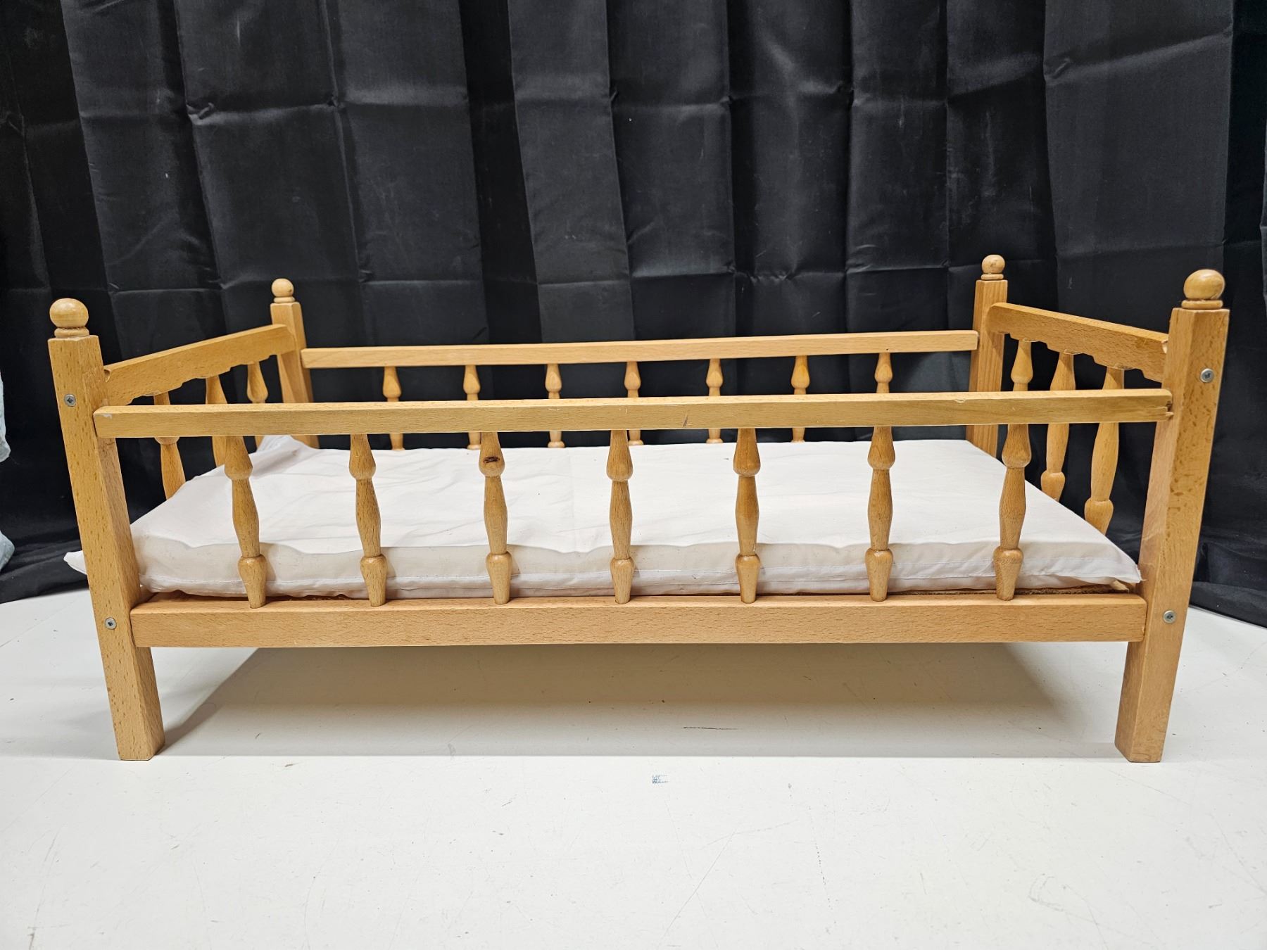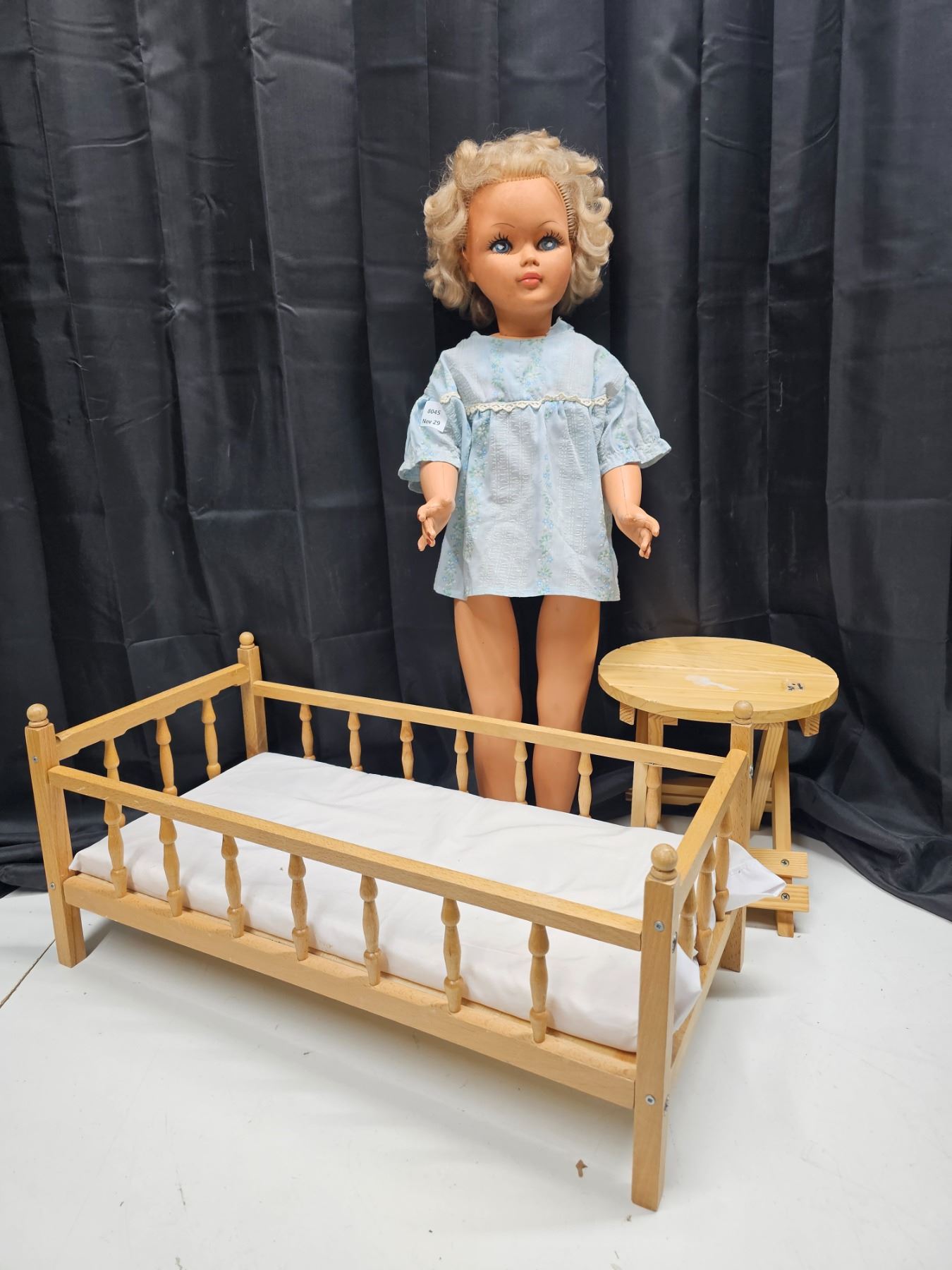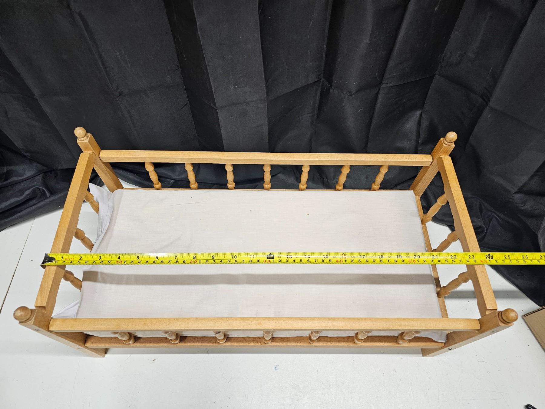 30" Vintage Doll with Wooden Doll Crib and Small Foldable Wooden Stool