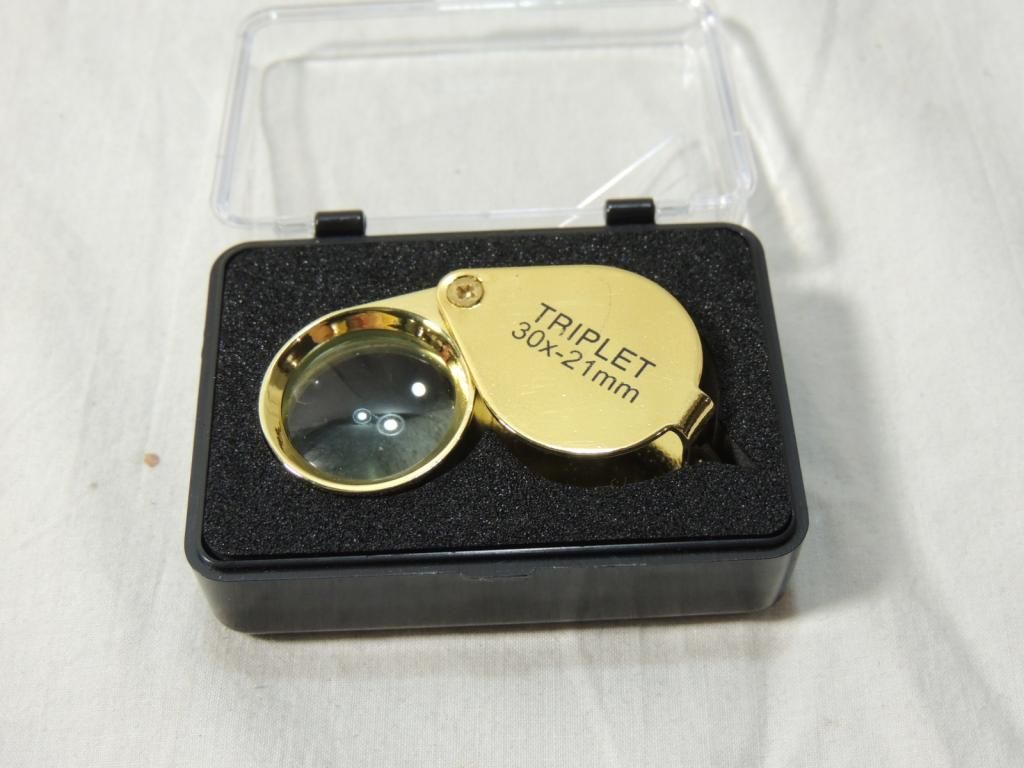 30x 21MM TRIPLET JEWELERS LOUPE WITH CASE. PROTABLE MINI 30X21MM TRIPLET JEWELERY LOUPE FOR JEWELRY TOOL EQUIPMENT. AS SHOWN. SEE PHOTO FOR MORE DETAILS.